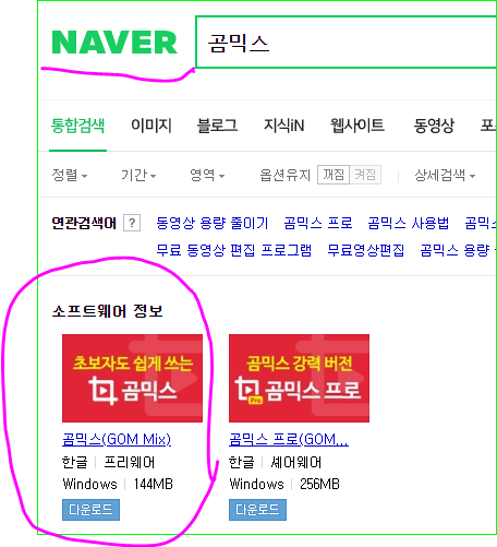 바로 네이버에서 곰믹스치면 소프트웨어 정보에 곰믹스,그리고 프로뜨죠