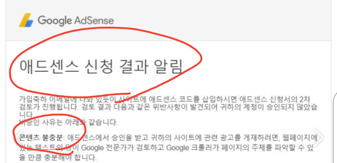 하신다면 구글애드센스에서 보내온 불합격 사유을 집중적으로 보완해서 재신청을