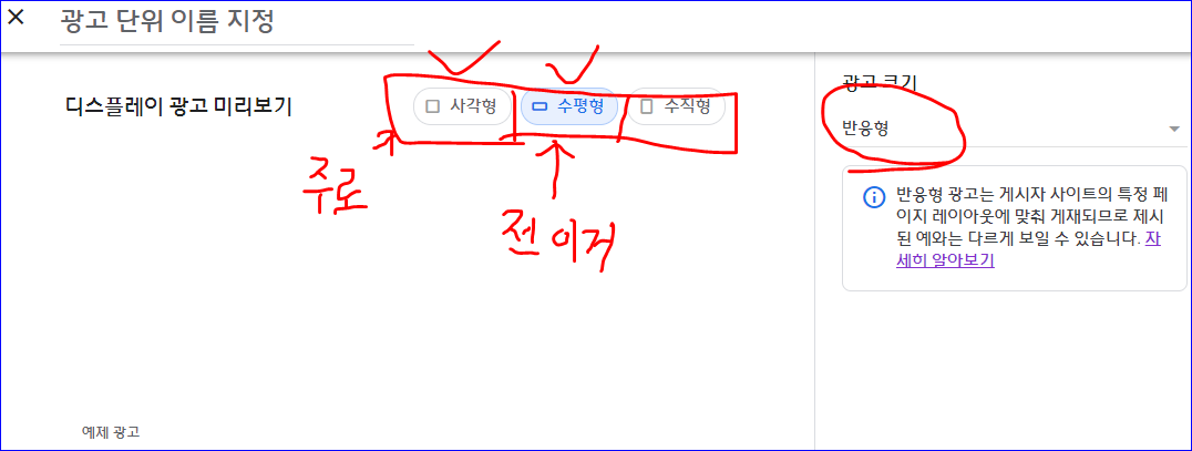 그럼 광고 단위 이름 지정이라고 나오고 디스플레이 광고 에 사각형 수평형 수직형이 나옵니다.