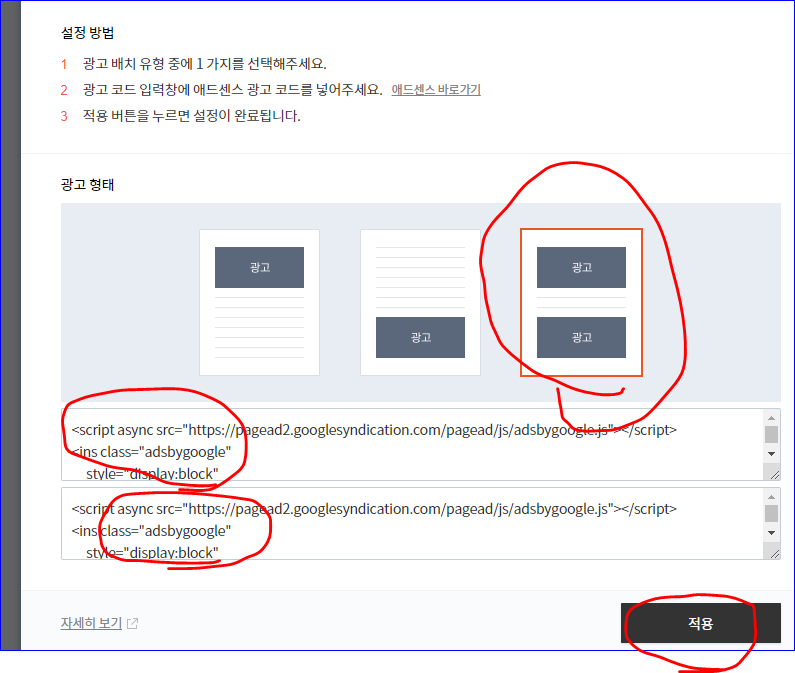 광고을 넣을 위치 위.아래.상하형을 선택해서 코드 붙여넣기하시면 됩니다.