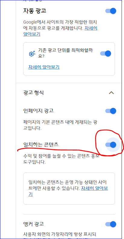 일치하는 콘텐츠와 자동광고설정을 해제하는 것이 좋습니다.