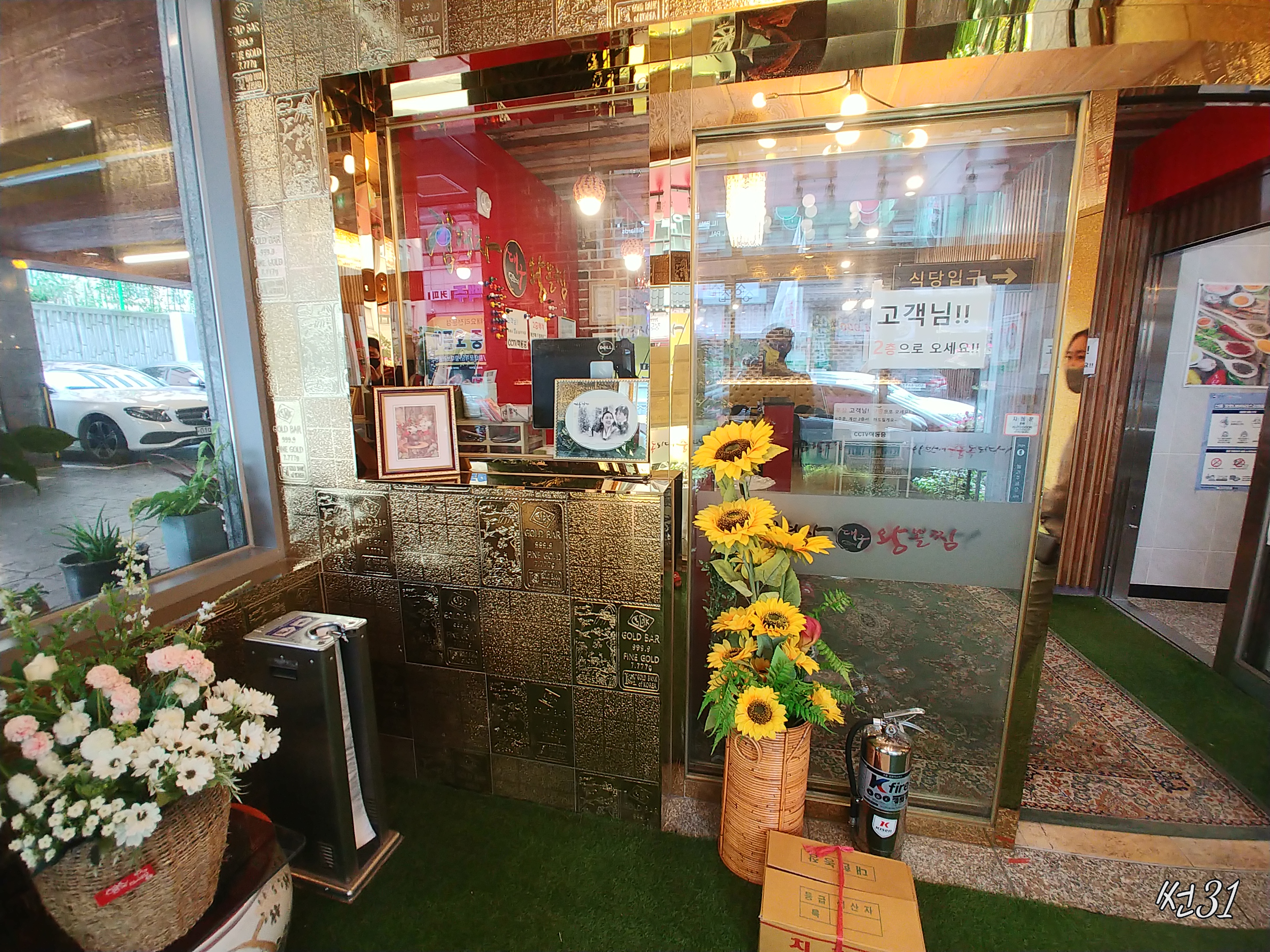 내부을 들어서면 해바라기꽃과 예쁜꽃을 몇개 꼽아 놓았습니다. 건물 새로 올린지 얼마 안되는지 내부가 깨끗합니다. 수원본점 길건너편쪽네 허름하게 김경자왕대구뽈찜 간판이 낡은것이 붙어있는데 아마도 장사잘되서 건물올리기전에 사용하던 식당터가 아닌가 싶습니다.