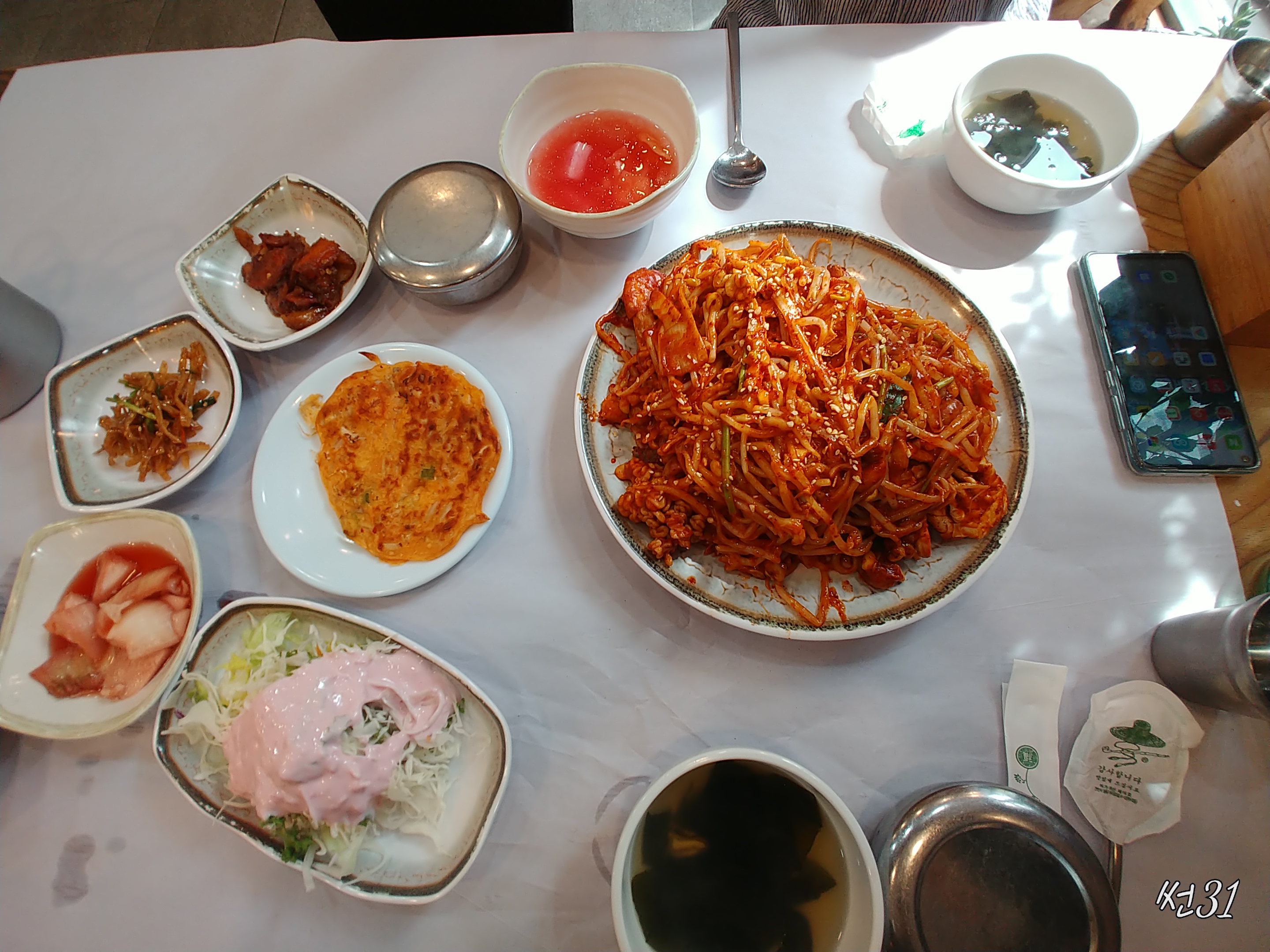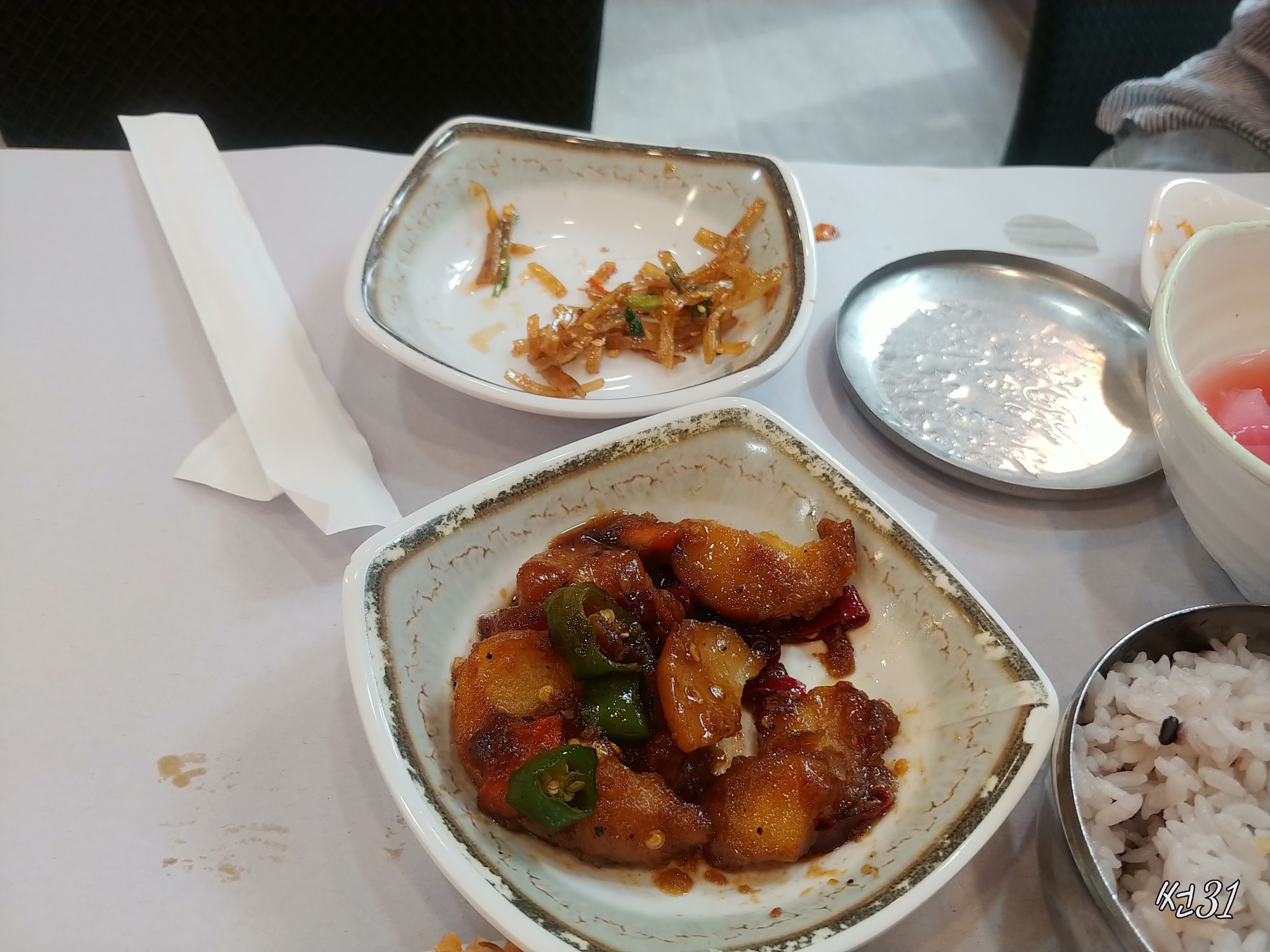 요 감자튀겨서 (볶아서?)양념에 묻힌게 너무 맛있어서 한번더 시켜먹고도 너무 맛있어서 종업원에게 물어보니 반찬통으로 하나정도에 만원인데 근처 정자시장 반찬가게에서 사는것보다 맛있고 양도 만원기준으로 훨씬 더 많으니 감자볶음 좋아하시는 분은 밥먹는 중에 미리 주문해서 계산하고 나갈때 가지고 나가시면 됩니다.