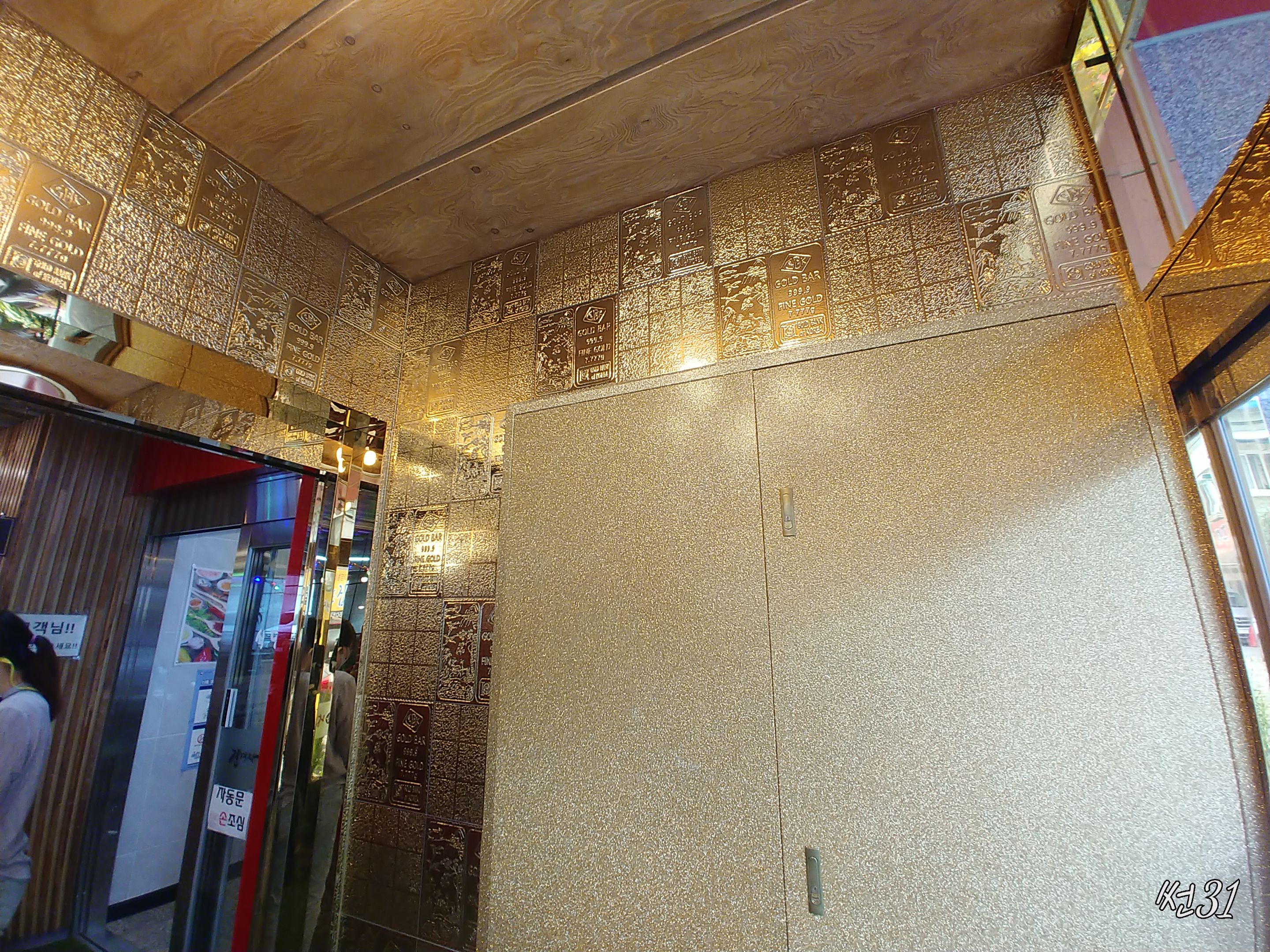 입구들어서면 벽에 금괴을 박아놓은것처럼 삥 둘러놓았습니다.진짜 금괴는 아니지만 이렇게 금괴모양 타일을 붙여놓으므로 강력한 돈의 기운을 받아들이겠다는 의미 같습니다. 번쩍번쩍 거리는것이 매우 화려하게 해놓았습니다.