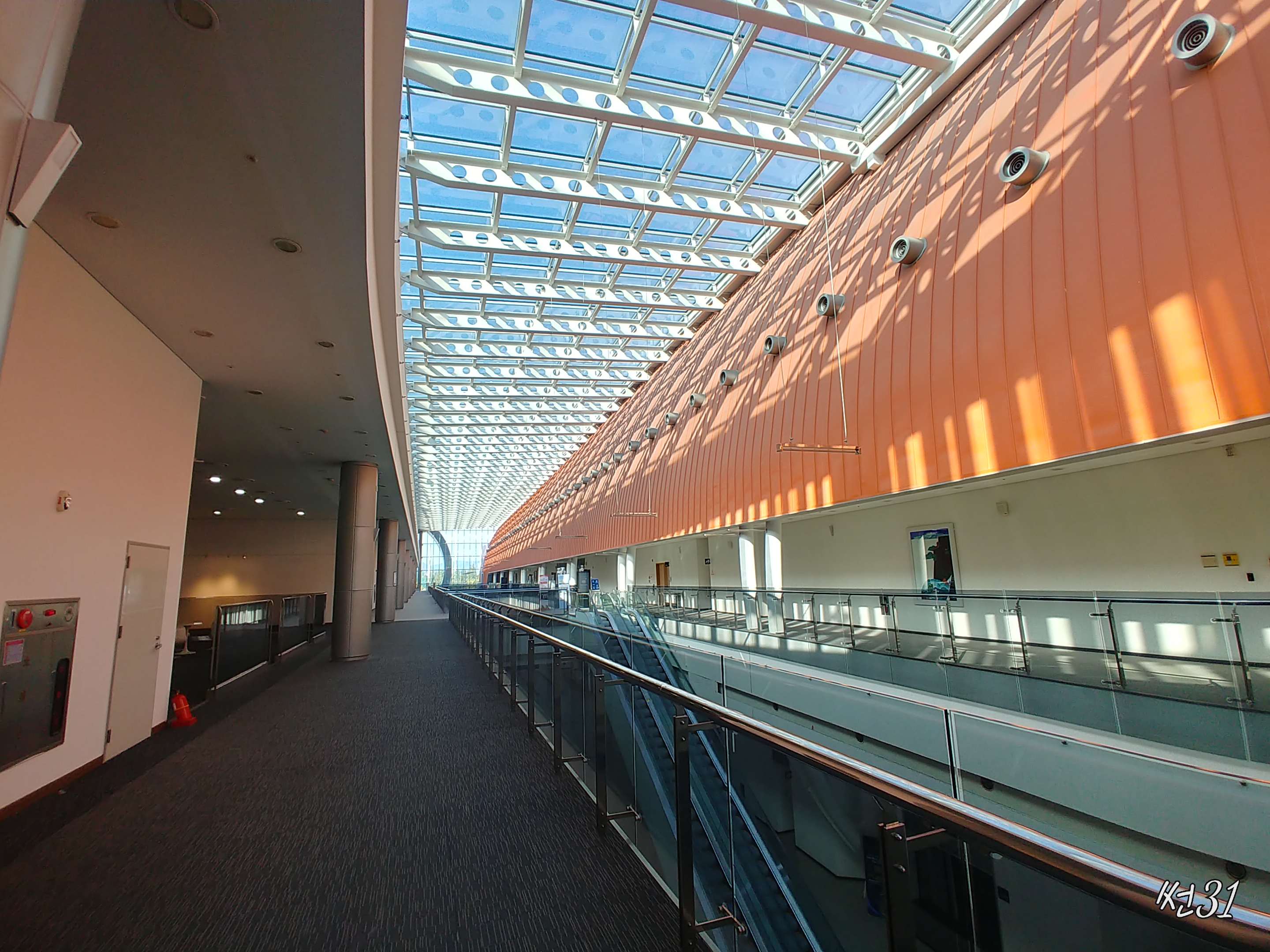 건물 2층 중앙에서 찍은 모습인데 천장이 환하게 유리로 투명하게 되어있는 구조라서 시선이 굉장히 탁트인 느낌을 주고 햇살이 가득 들어오는 채광좋은 형태라서 크고 넓은 건물 안이 환한 느낌을 줍니다. 길게 통로가 양쪽으로 시원하게 뚫여있고 중앙은 그냥 뚤어놓았습니다.