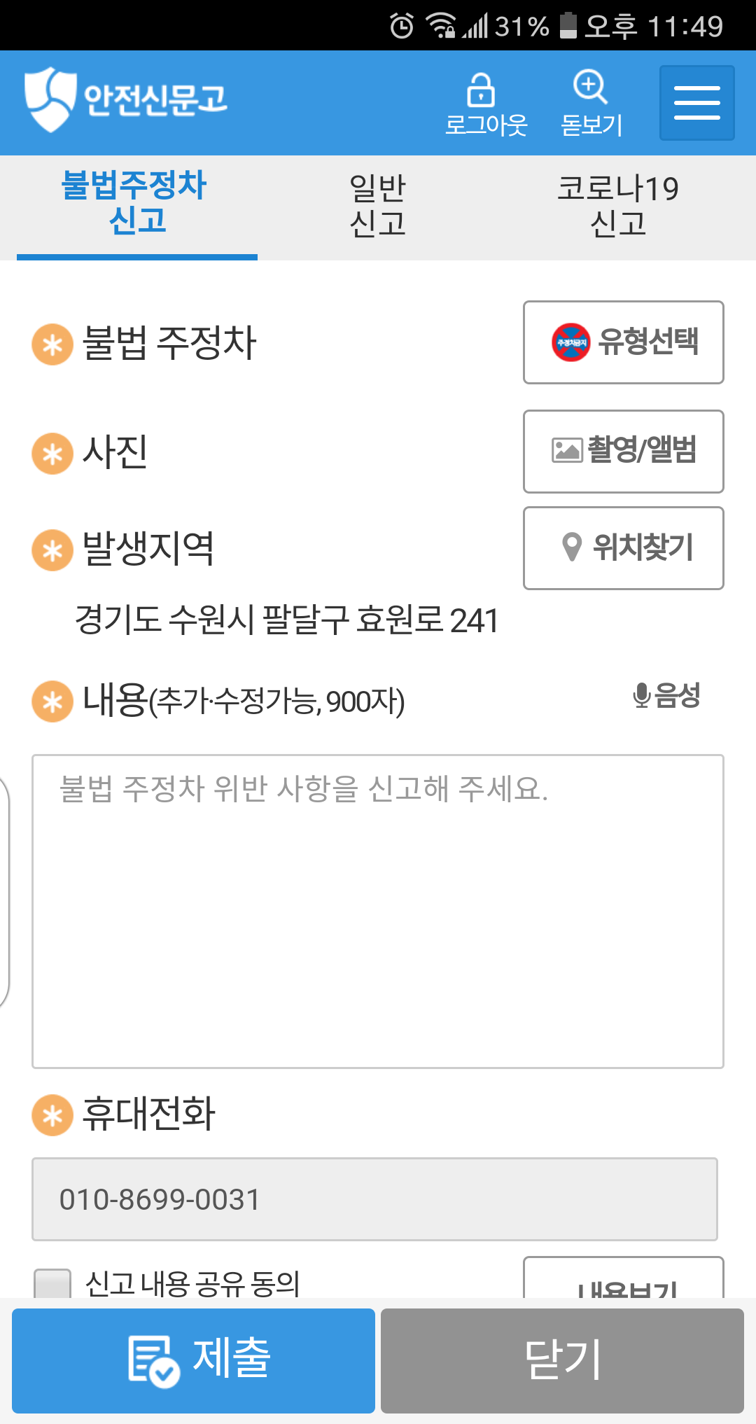 앱을 다운받아서 내폰에 깔아주시고 실행시킨휴 간단한 로그인과정을 거치면 이제 본견적으로 신고를 할수있게됩니다.