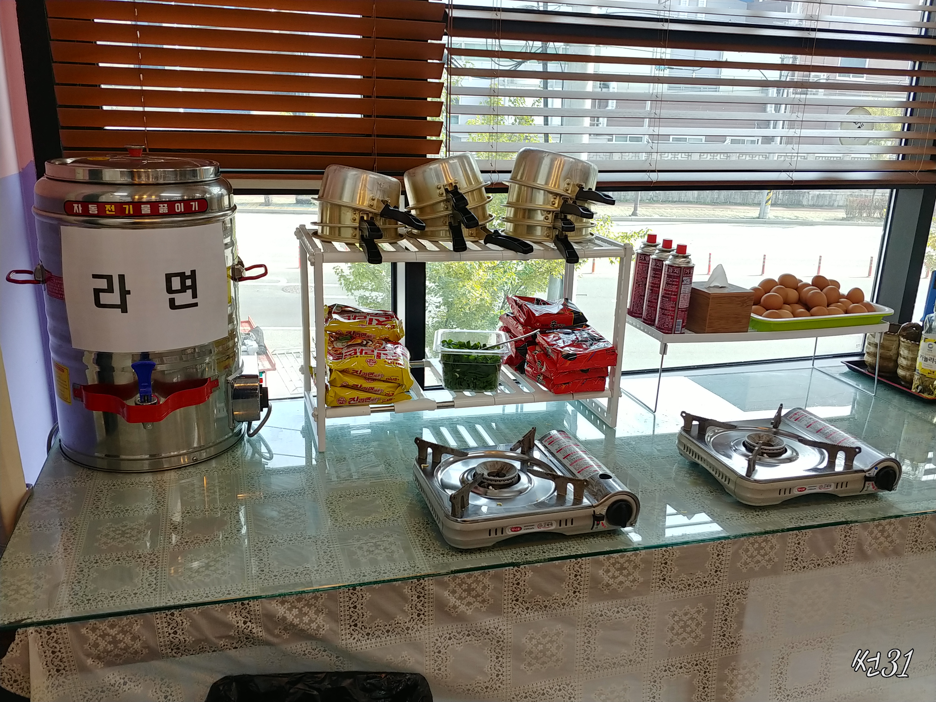 짜잔 라년 먹는코너인데 버너도 화력좋게 준비되어있고 라면도 종류별로 다양하게 즌비되어있습니다.