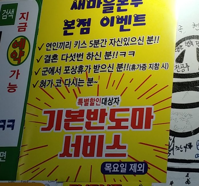 연인끼리 키스5분간 자신있으신분, 결혼 다섯번하신분, 군에서 포상휴가 받으신분(휴가증지참시),혀가 코 다시는분 중에 하나라고 해당이 되면 특별할인대상자로 기본반도마서비스를 제공해줍니다. 다만 목요일은 네외입니다.
