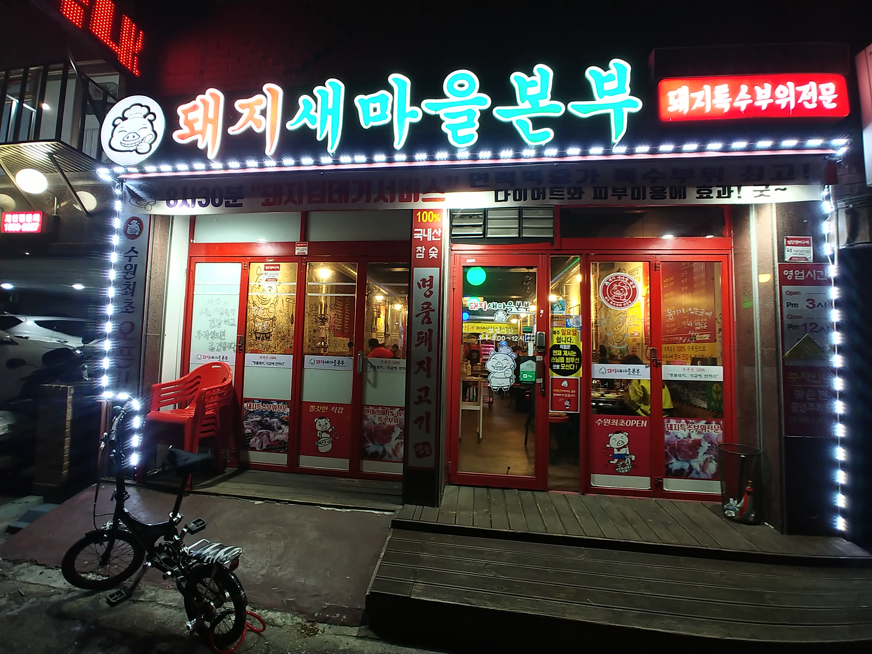 직접 가게 문앞에 도착하니 헛 진짜 가게이름이 돼지새마을본부이었습니다.
