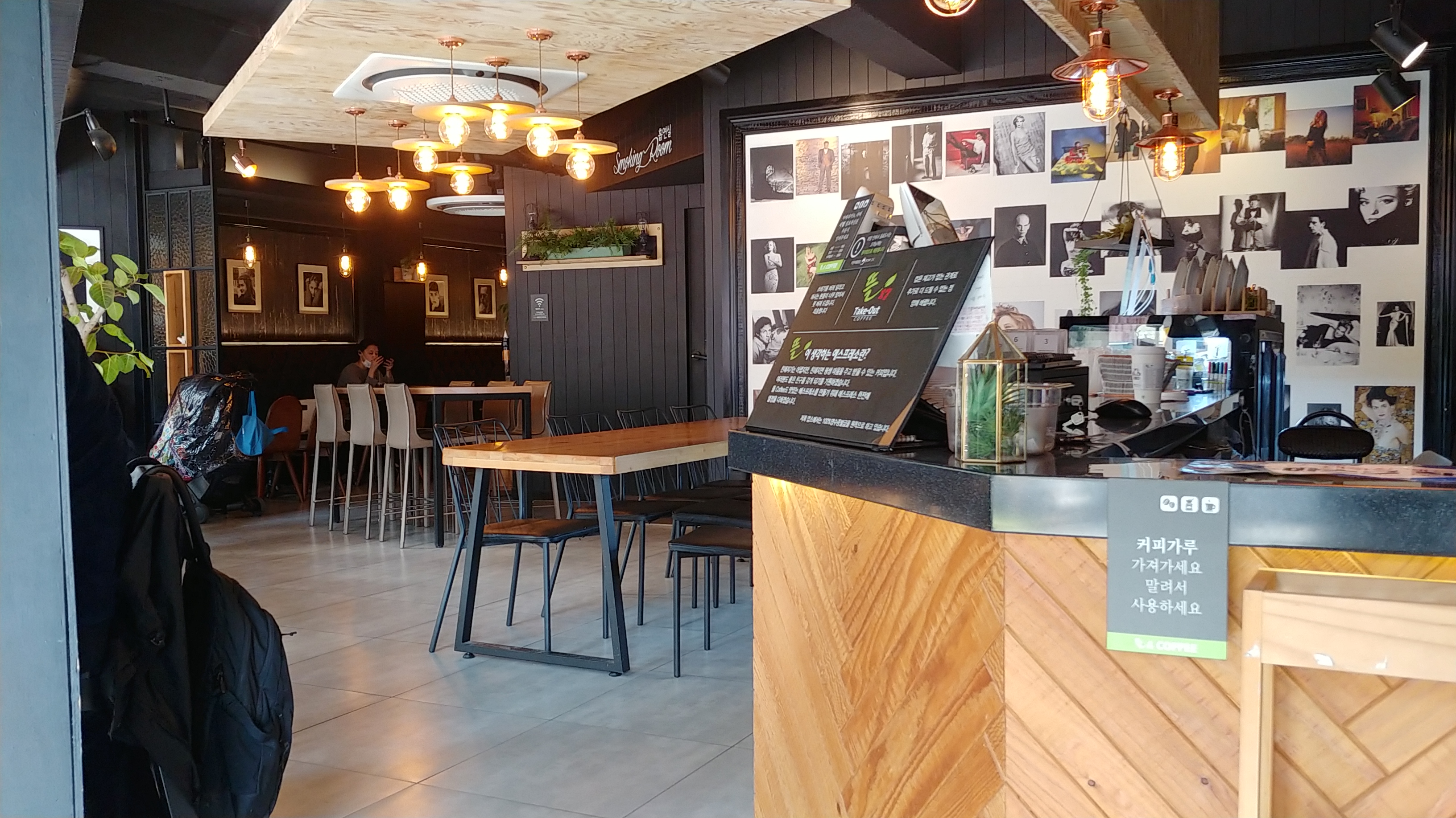 카운터모습인데 여느 커피숍과 비슷한 느낌이고 커피점의 가장 큰 특징인 검은색바탕 메뉴판은 어쩔수가 없나봅니다.