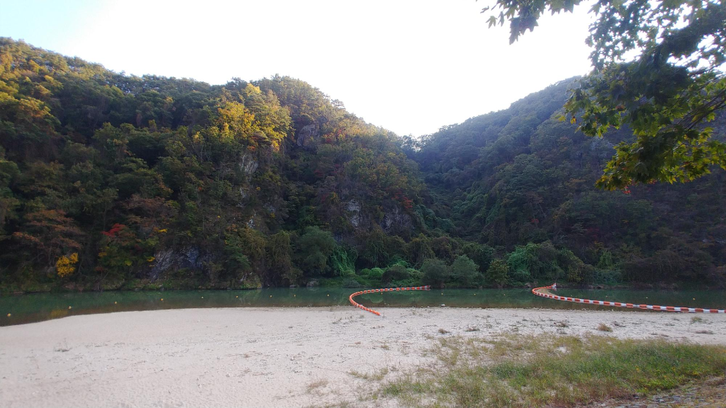 가을 단풍과 흐르는 강물 그리고 뒤로 보이는 산새가 절묘한 조화를 이룹니다.