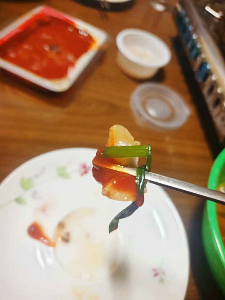 초장에 같이온 양념부추를 한두가닥 감아서 먹는모습입니다.