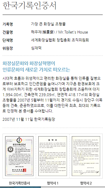 심재덕 전 수원시장이 지은 수원 해우재 가장 큰 화장실 조형물로 한국기록인증서을 획득했습니다.