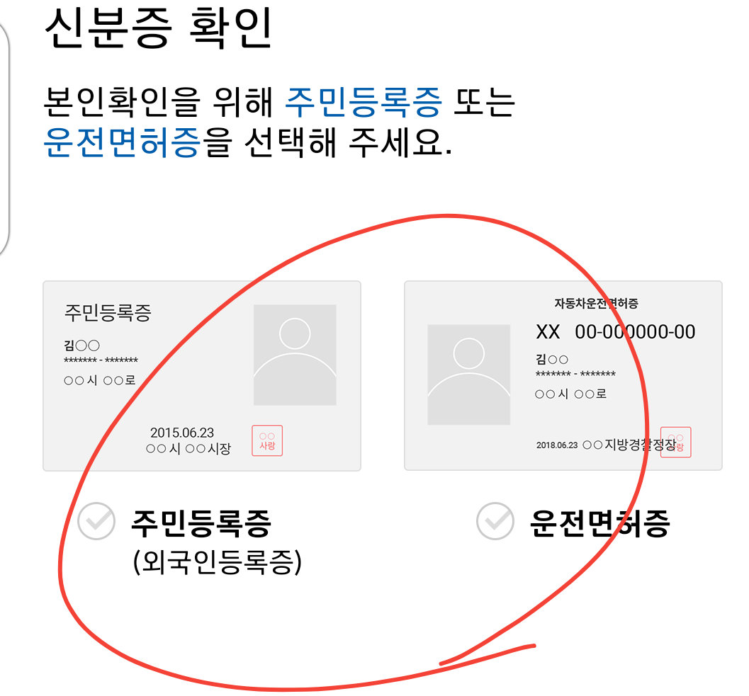 신분증 확인은 운전면허증이나 주민등록증 둘중에 하나 선택하면 됩니다.