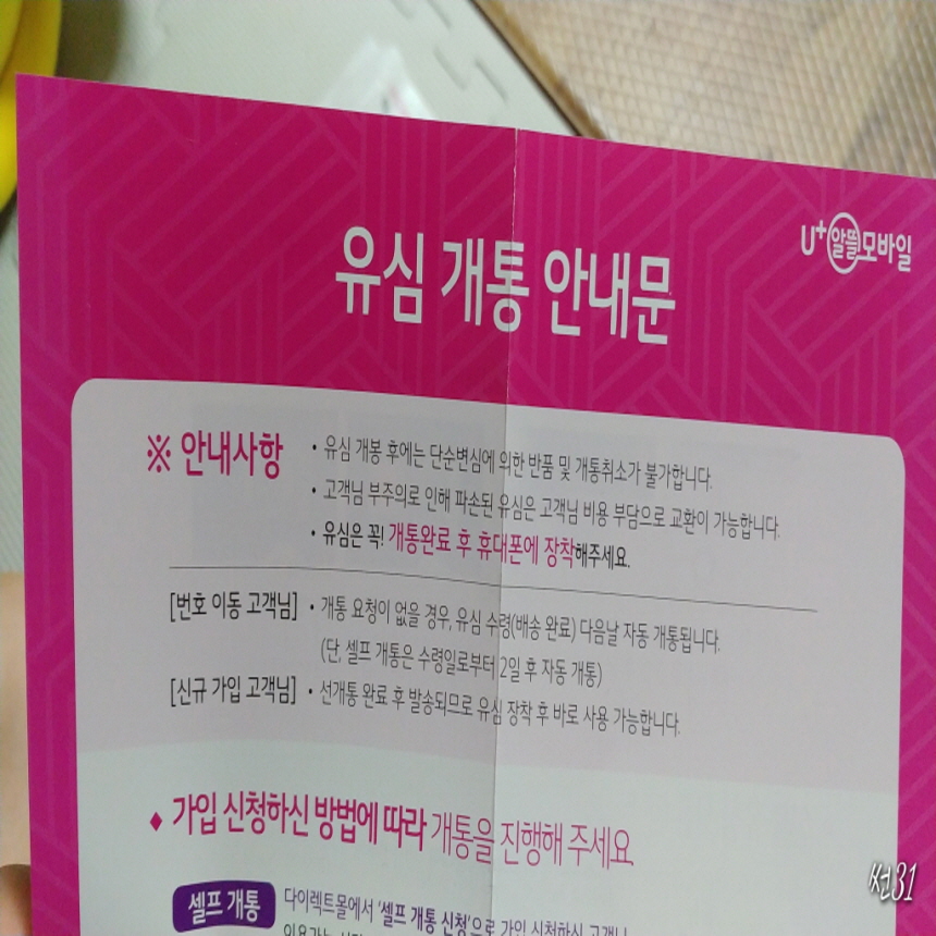 ![]() 유심개통 안내문에는 유심을 받으면 개통완료 후에 꼭 휴대폰에 장착하라고 나옵니다. 셀프개통으로 진행하면 되요 |