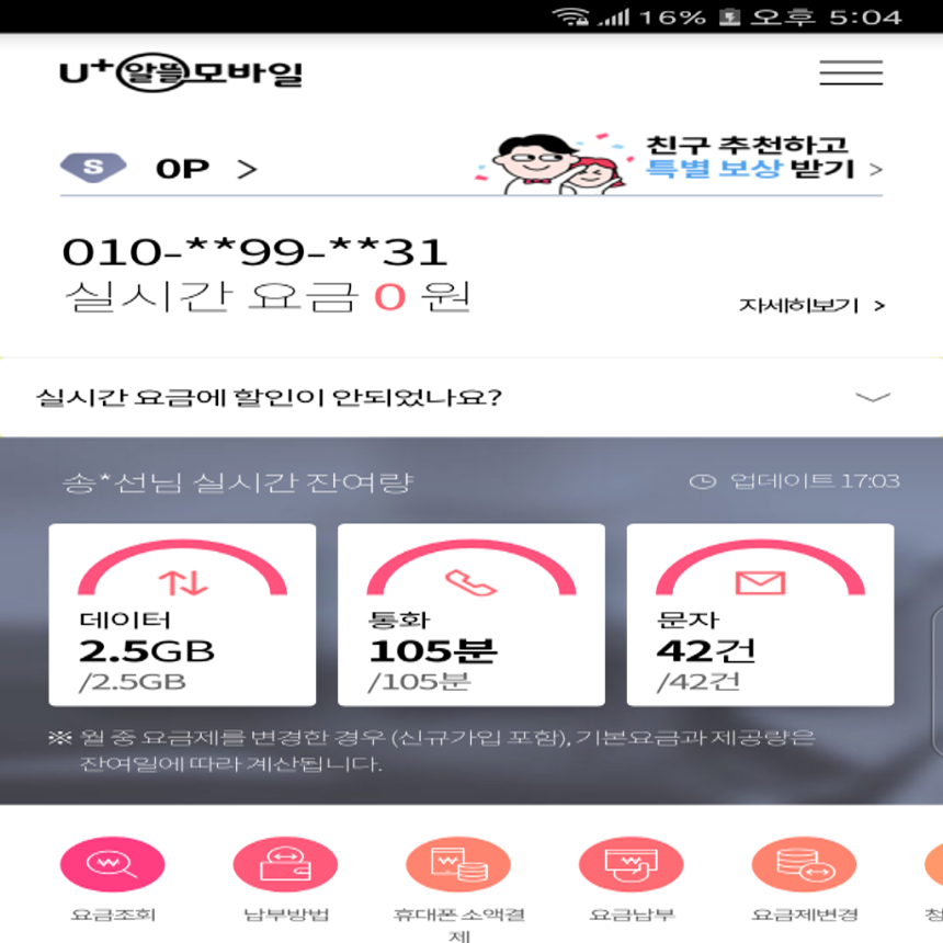 ![]() 알뜰폰 유플러스 앱을 깔고 실행한 모습 |