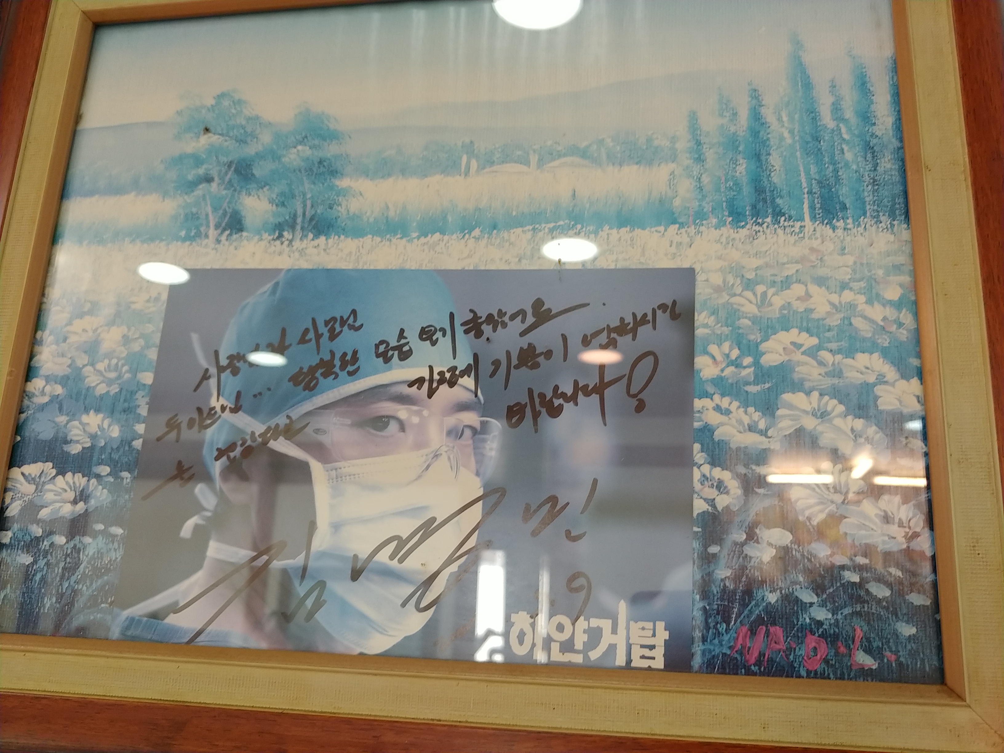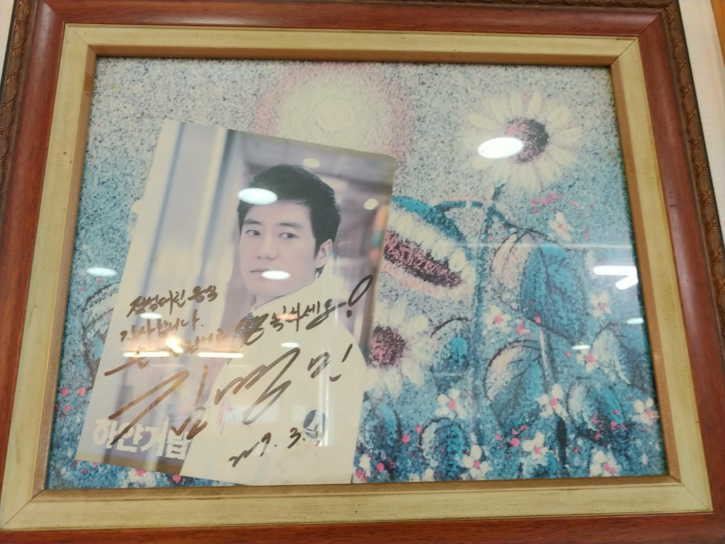 하얀거탑이 언제적 드라마인지 모르겠는데 사진을 보느 오래된듯이 바랜 사진과 그 드라마 주인공인 김명민이라는분이 사인을 멋지게 해주시고 갓내요.