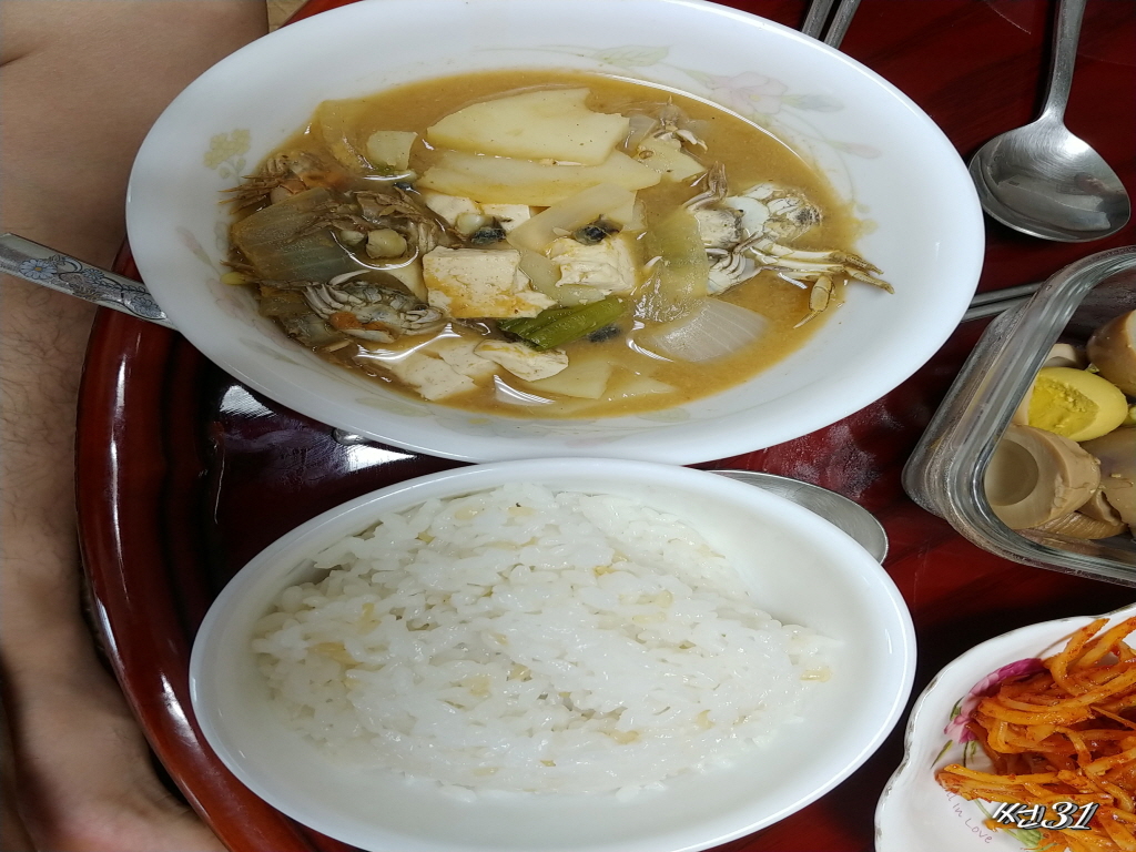 게와 고동을 함께 넣어서 된장찌개요리를 한 모습입니다.
