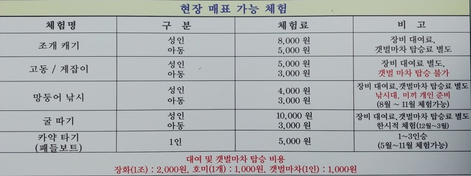 현장 매표 가능체험으로 조개캐기, 고동 게잡이, 망둥어낚시, 굴따기,카약타기 가 있습니다.