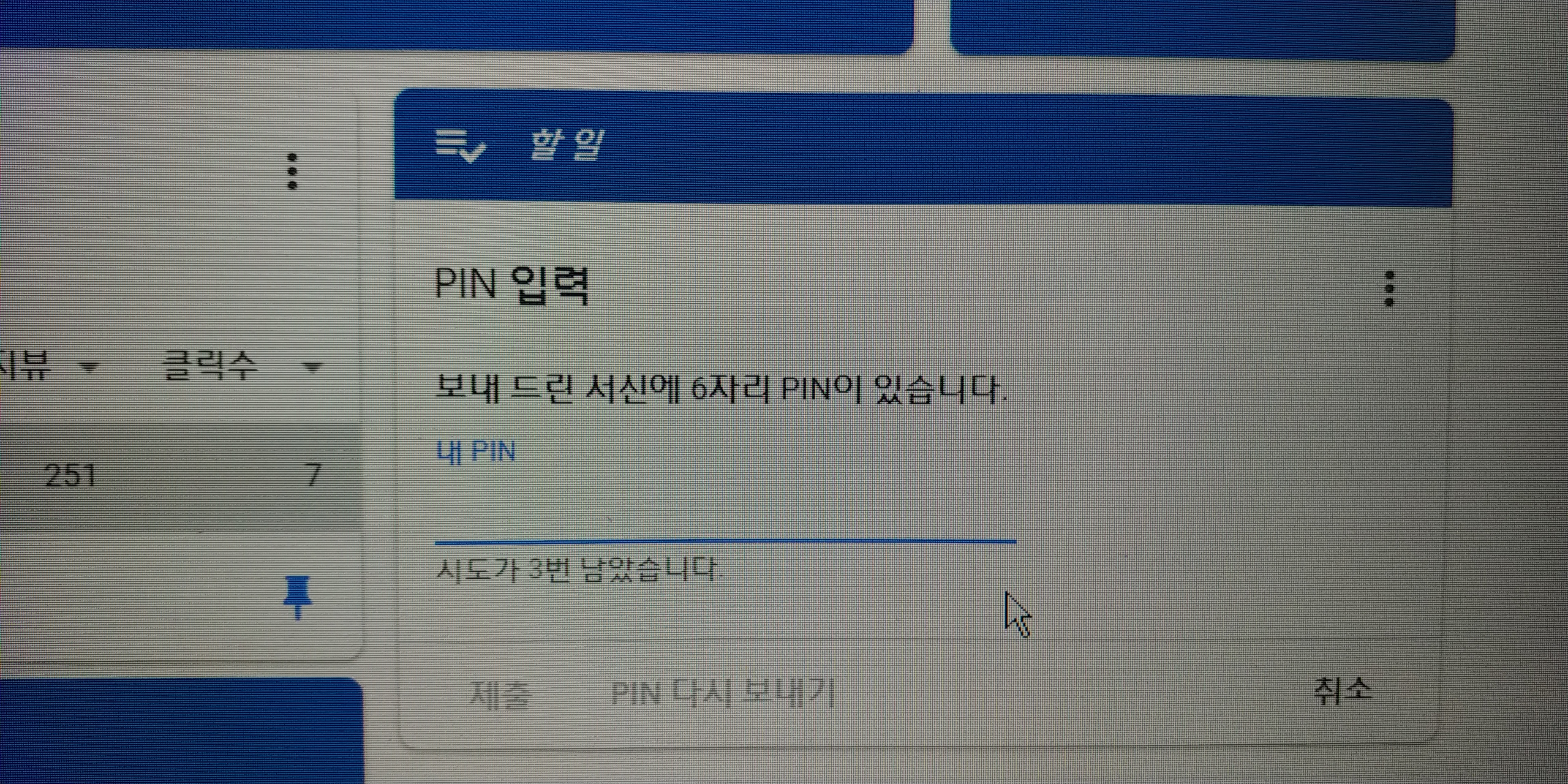 그럼 이렇게 화면 우측에 할일에 구글애드센스 핀번호 입력란이 나오는데 여기에 우편으로 발송되어 도착한 6자리를 입력하면 딱 나옵니다.