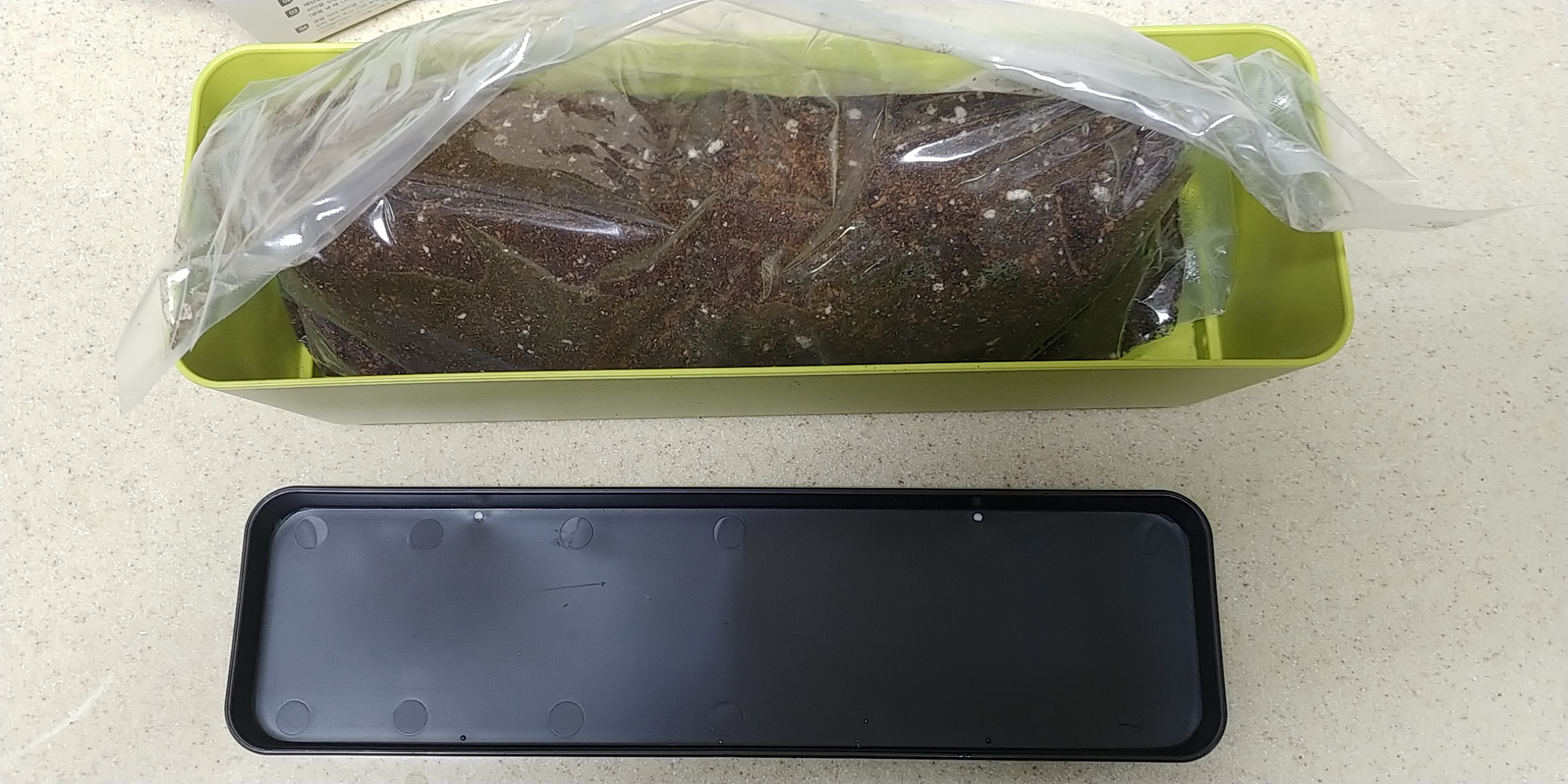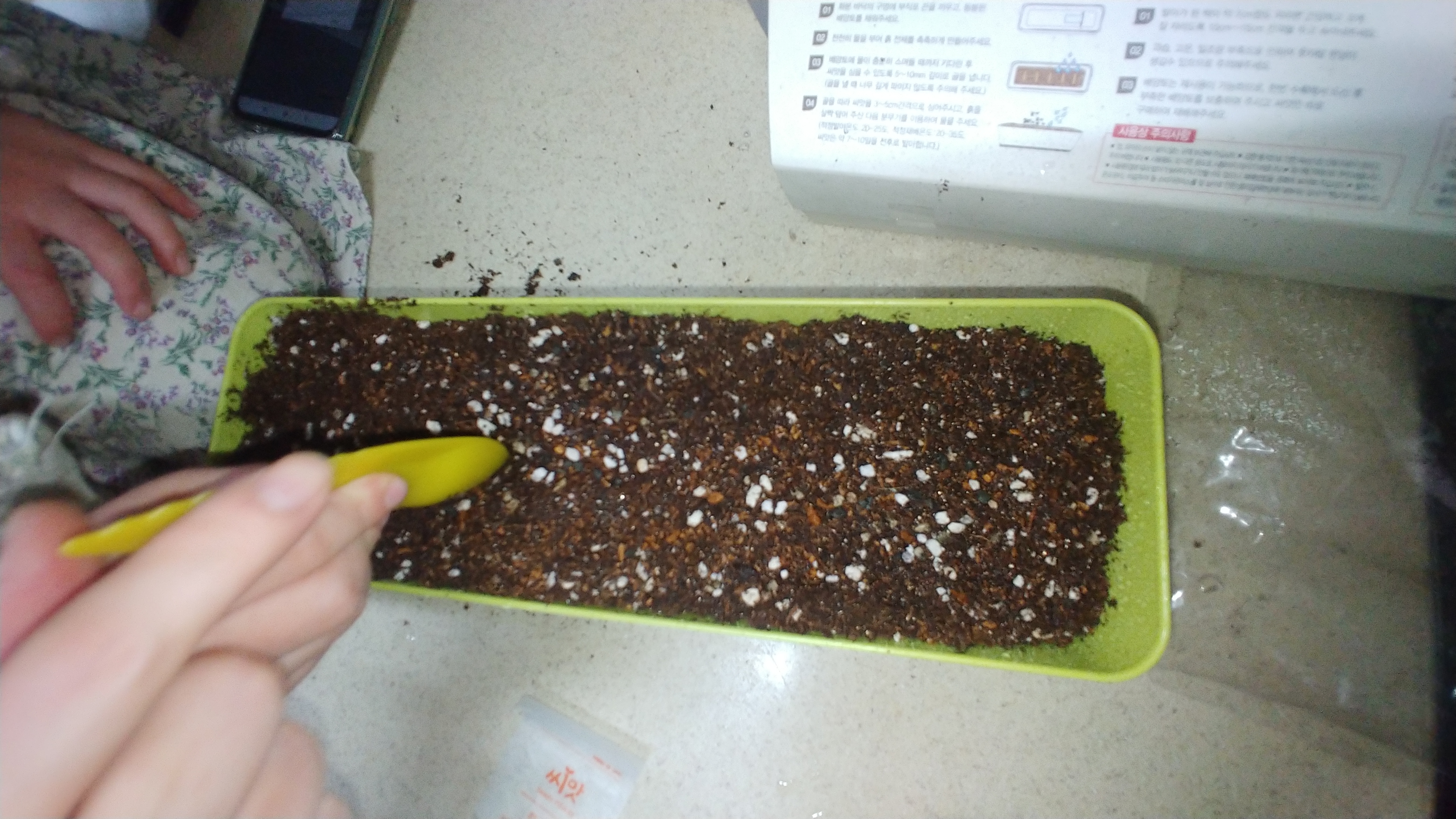 플랜터 즉 플라스틱 통에 흙을 부어줍니다.