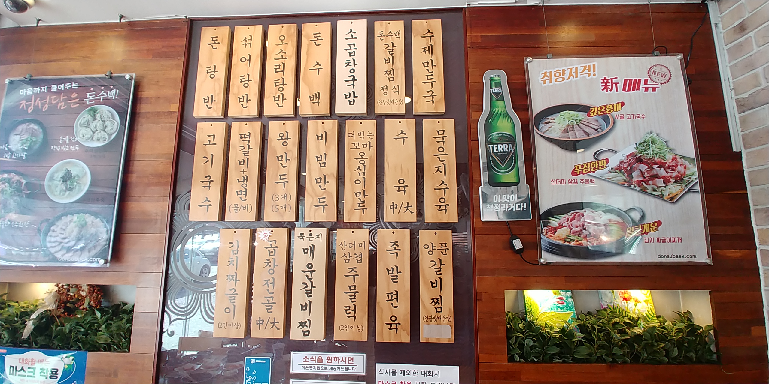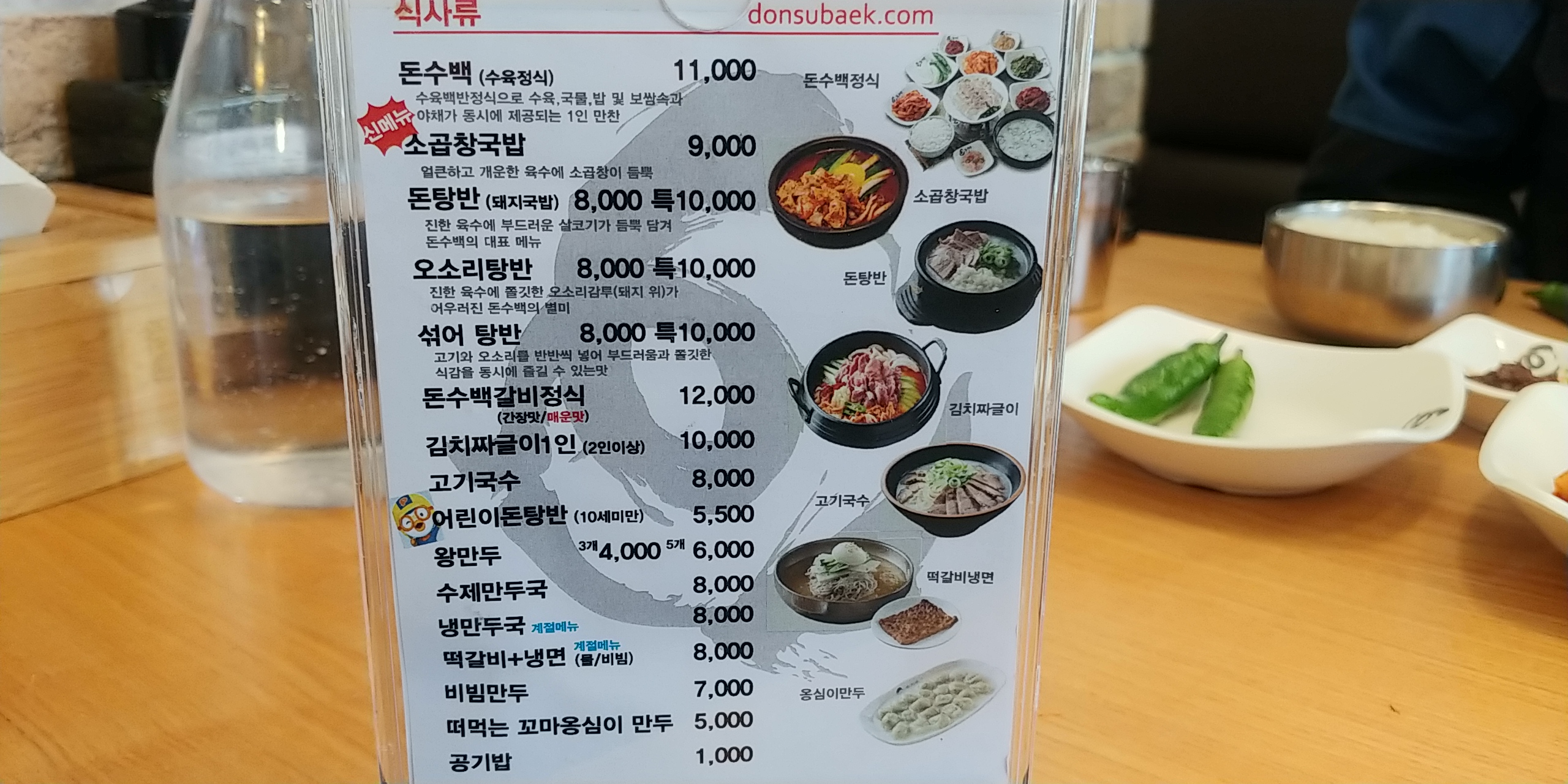 메뉴로 돈탕반 섞어탕반 오소리탕반 돈수백 소곱창국밥 갈비찜 순대만두국 고기국수 왕만두 수육 묵은지수육 김치짜글이 족발편육 등등