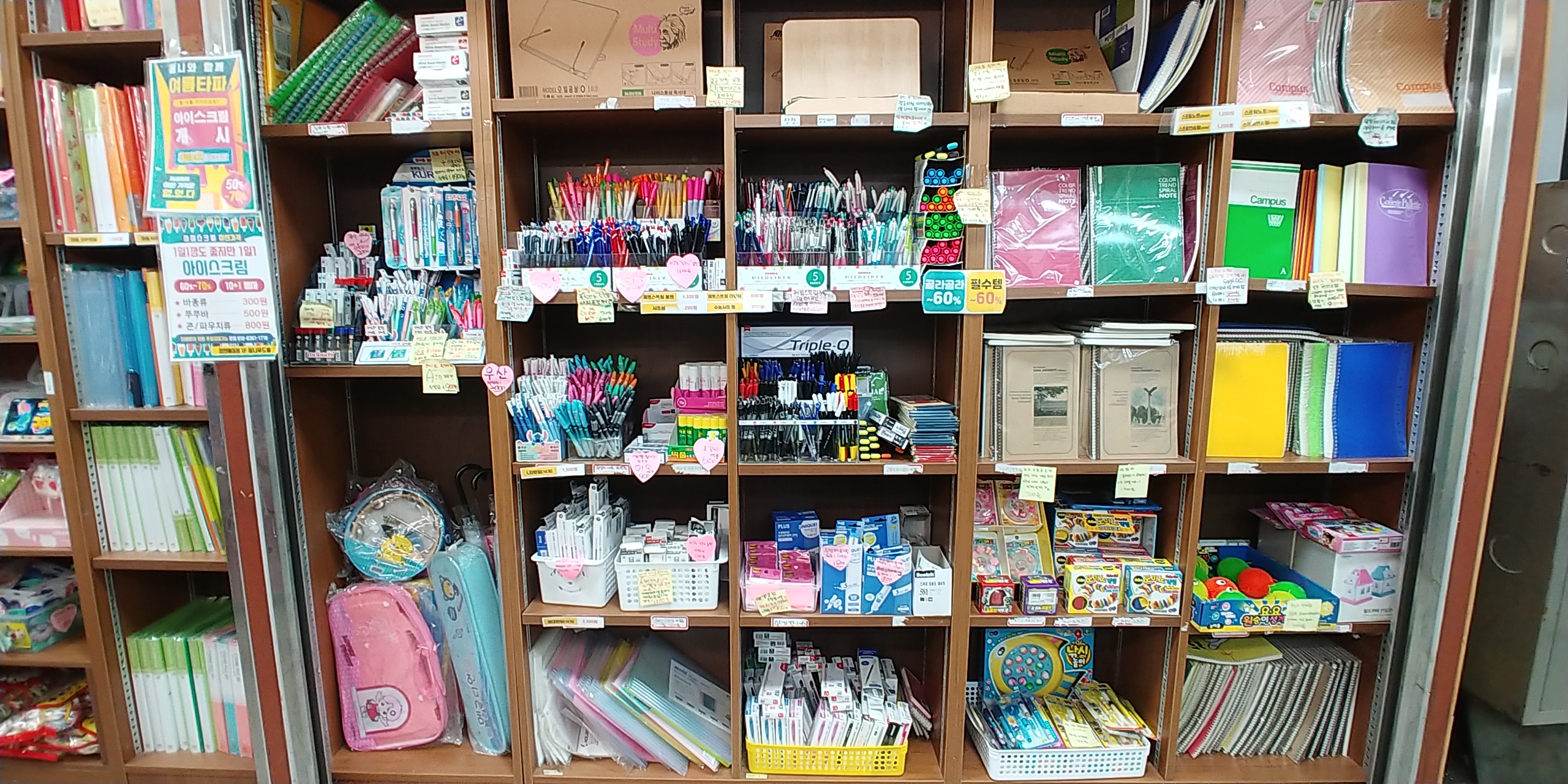 바로 밑에 다이소가 있는데도 과감하게 이렇게 필기구를 판다는건 좀 오바인거 같기도 했는데 통로 벽에 진열장에는 연필 공책 지우개 풀등 각종 문방구 필기류가 이렇게 빼곡하게 진열이 되어있어