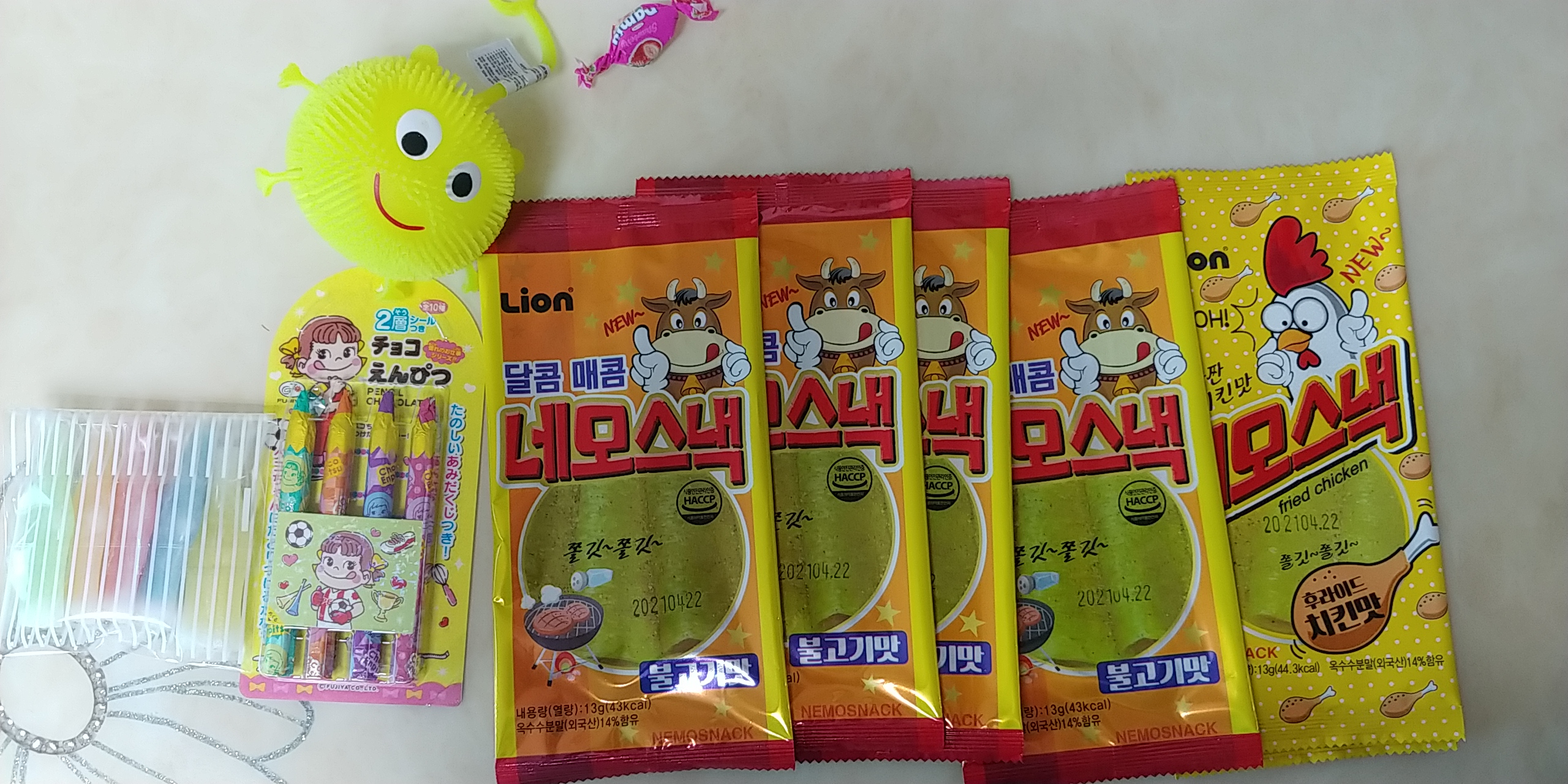 연필초콜릿은 집에서 먹어보니 아이들이 맛도좋고 너무 신기해서 좋아할만 하겠다는 생각이 들었어요.네모스택은 쫀득이지포같은거 찢어먹는건데 이게 뭔가 싶어 먹어보았는데 제 입맛에는 너무 간이 강해서 양념이 너무 세서 입맛에 안맞던데 아이들은 너무 좋아하드라고요.