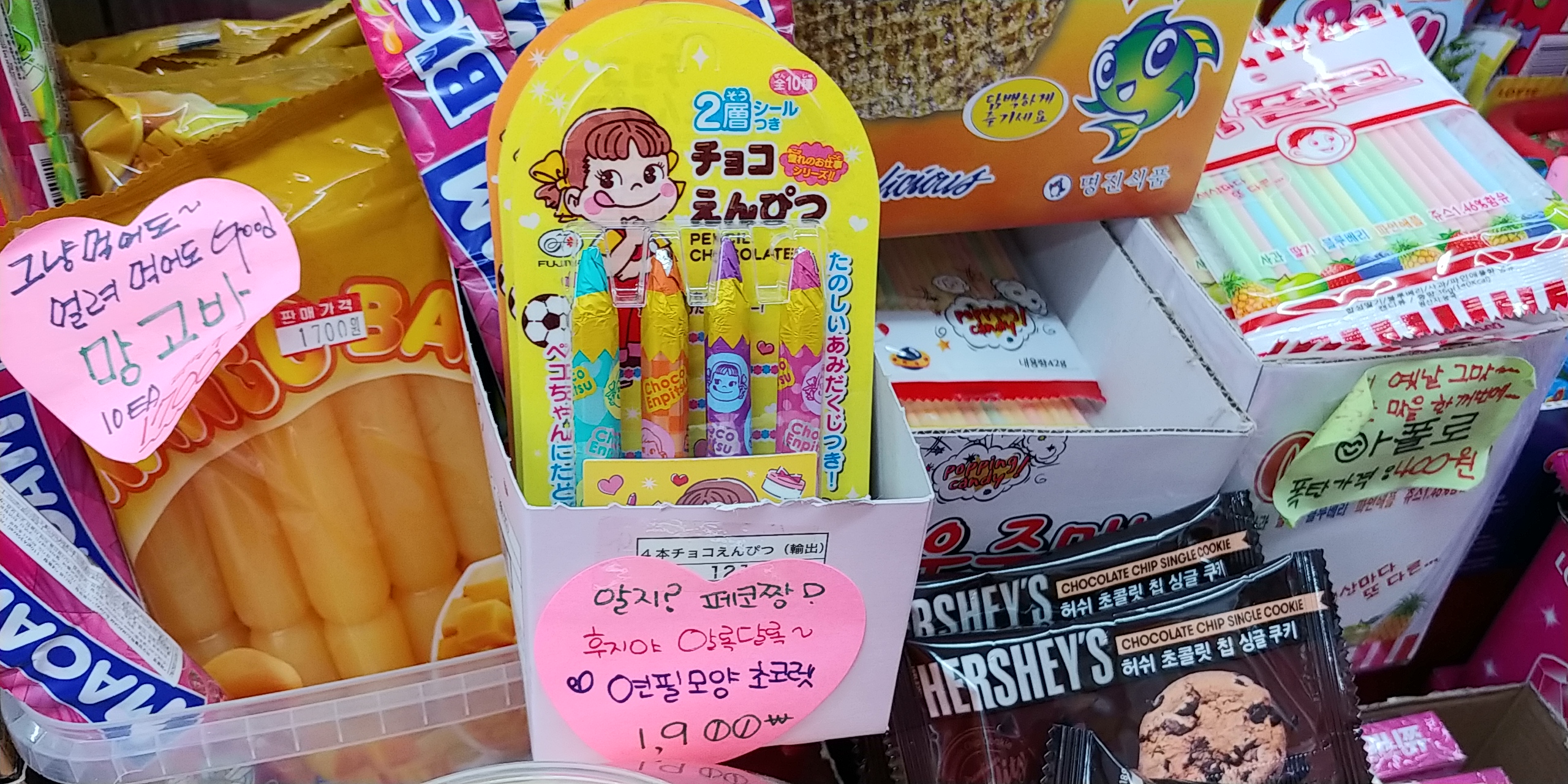사람들이 많이 다니는 메인통로가 아니라 옆으로 빠지는 사이드통로라서 과자진열장을 세워놓았는데 안에 있는 과자양만큼이나 많은 과자를 진열시켜놓았습니다.