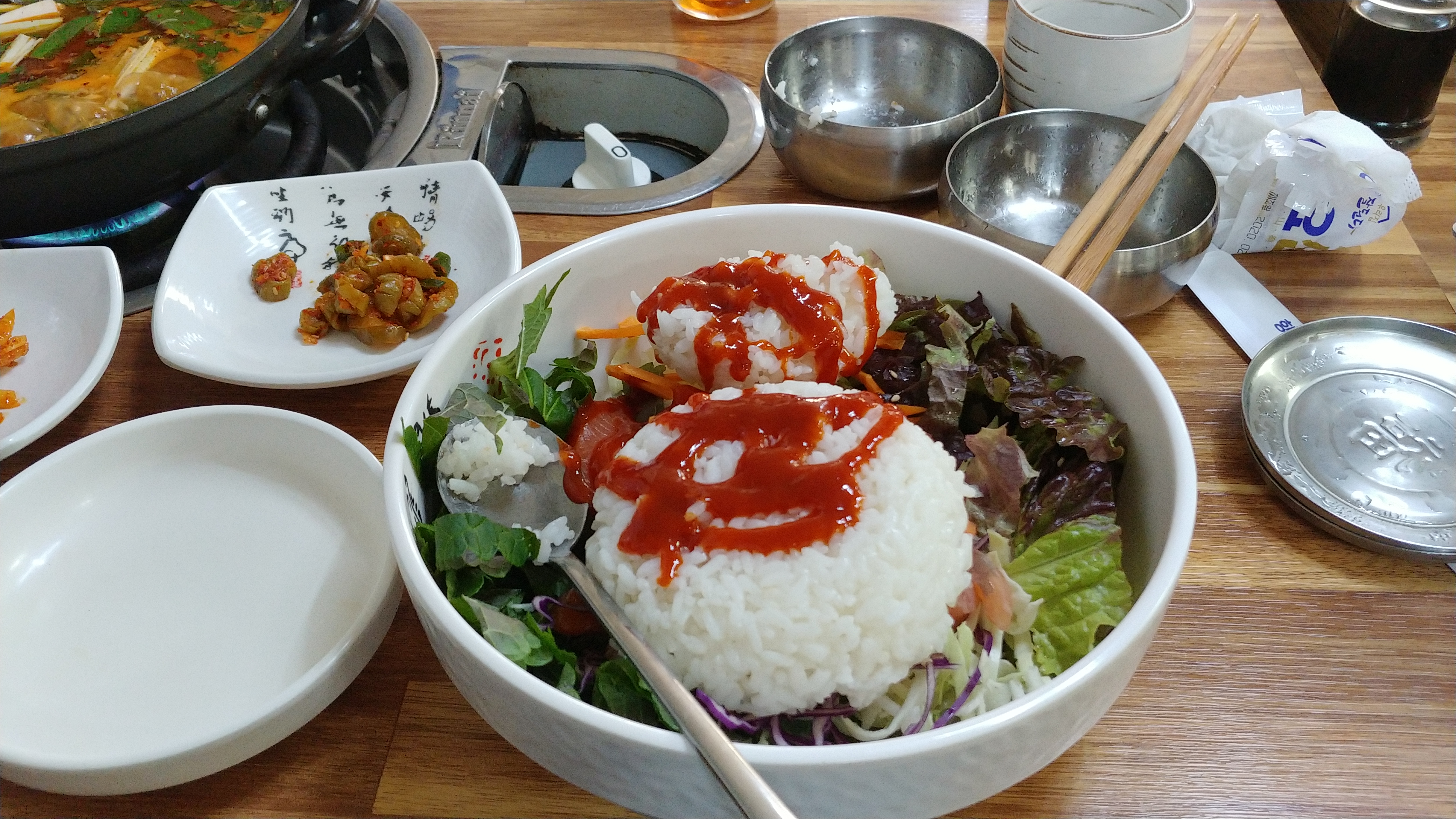 완벽하게 초고추장과 각종 신선한 상추야채 그리고 송어회와 밥이 어우러진 송어회덮밥 다 비빈모습입니다. 보기에만도 군침이 도는군요.