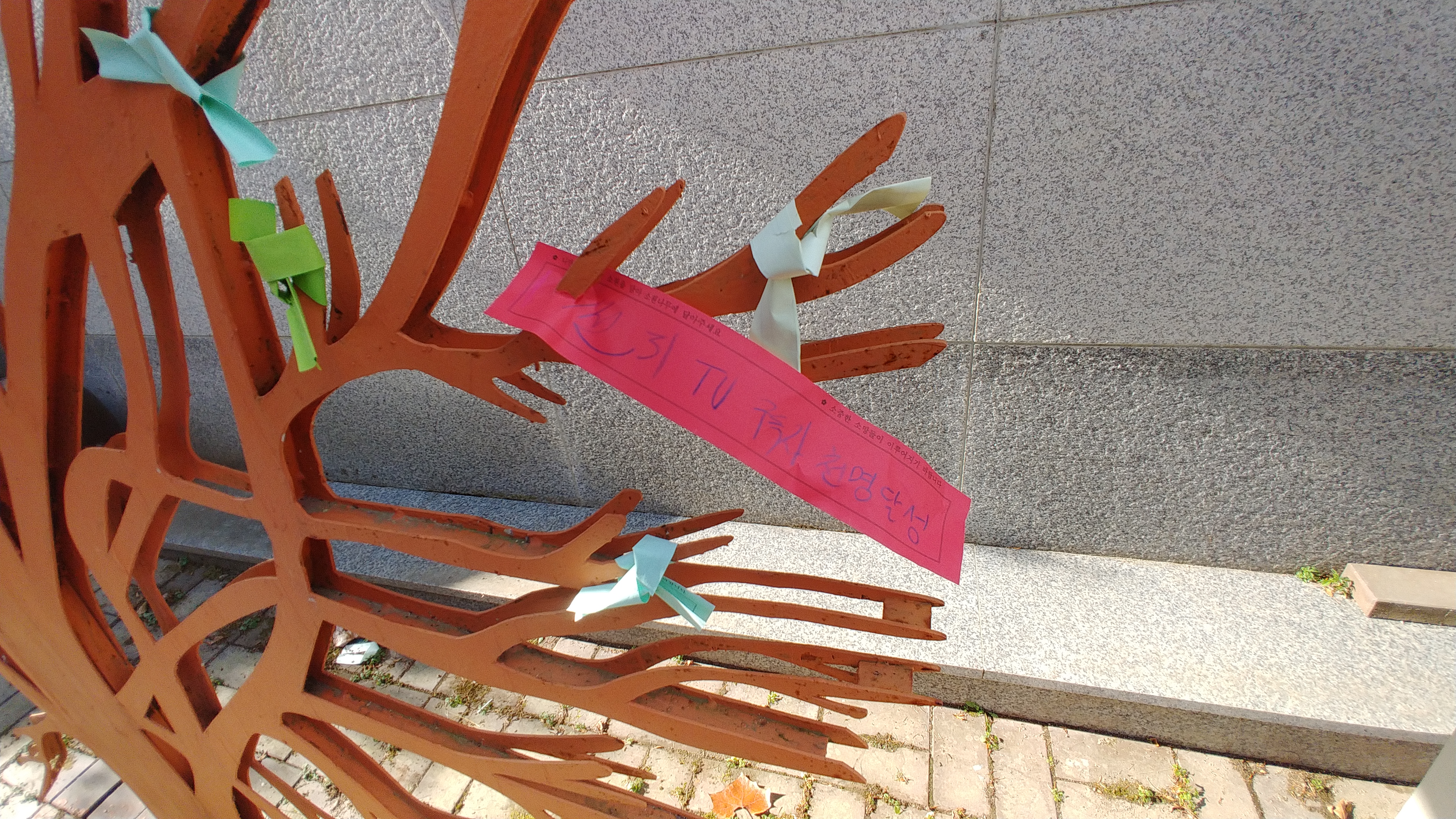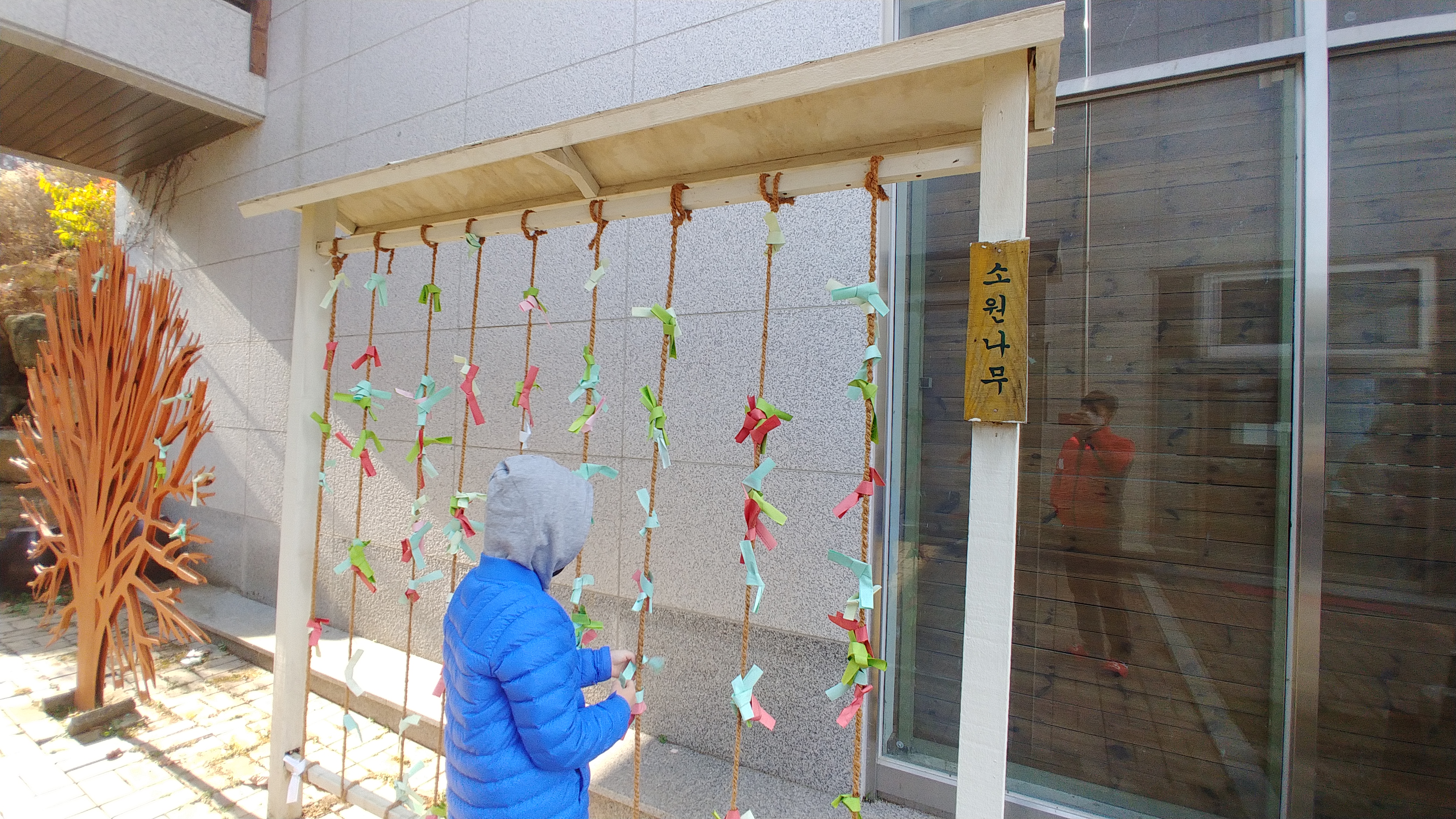 경기도 가볼만한곳 포천 한과문화박물관의 두건물 사이에 수원나무가 만들어져있는데요 교육관 건물이 좌측이고 우측이 박물관으로 간판이 붙어있는데 1층에서 종이리본에 소원을 적고 소원나무에 걸어주면 됩니다.