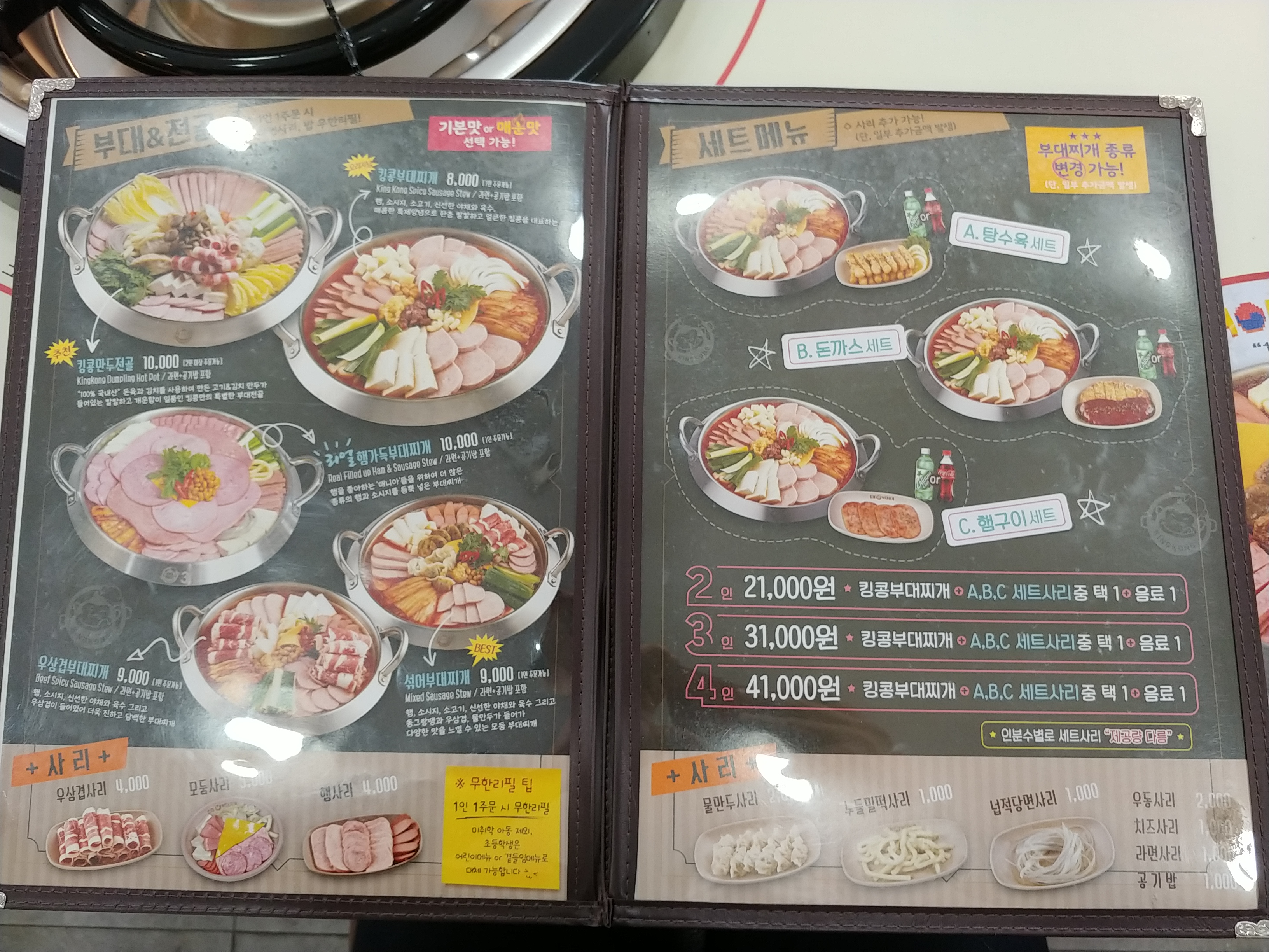 부대찌게 세트메뉴 A,B,C가 있는데 부대찌개변경도 가능하고 킹콩부대찌개에 탕수육?좀특이하죠 탕수육이 붙네요.