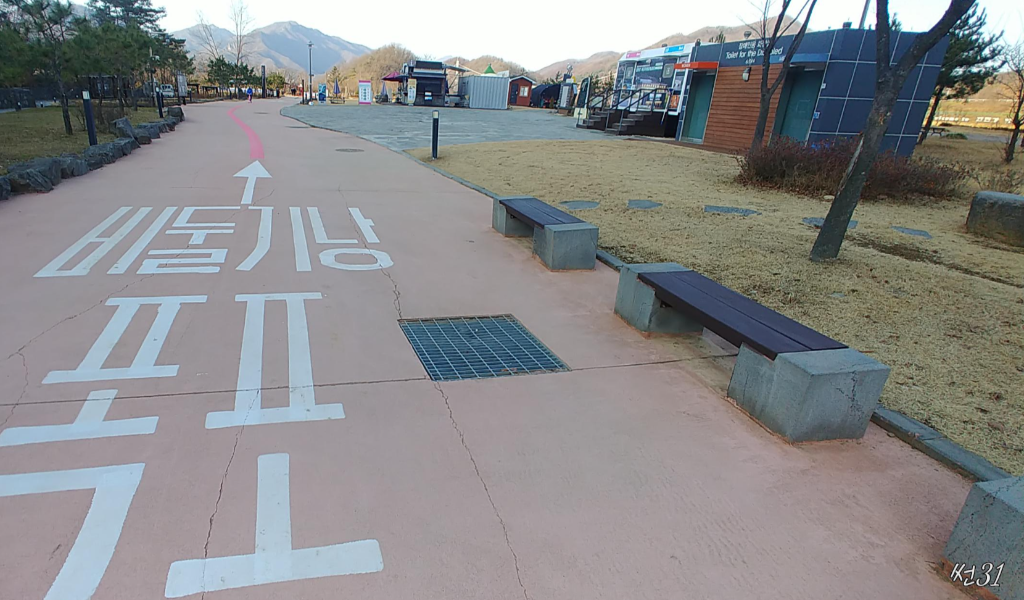 그옆에 캠핑장이 있고 위사진처럼 크게 바닥에 만들어놓은 안내표시를 향해서