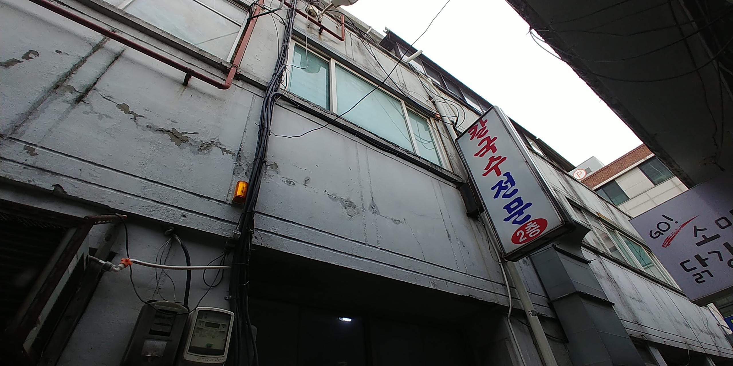칼국수전문 2층이라고 적힌 오래된느낌의 간판이 보입니다.