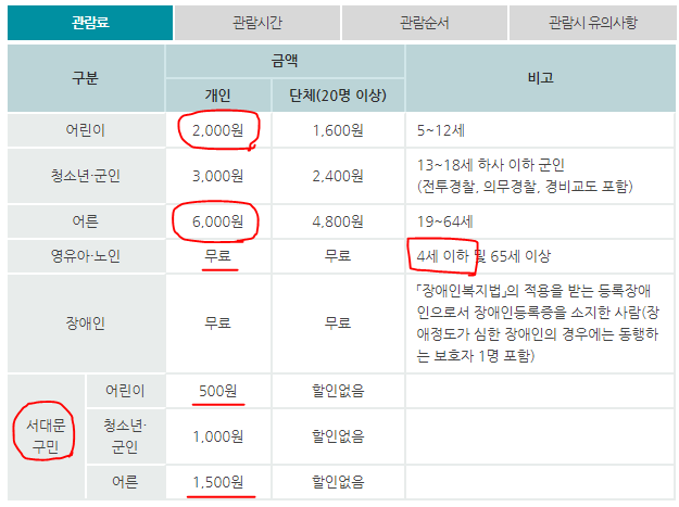 그담 중요한 가격관람료 관람료는 무척 저렴합니다.