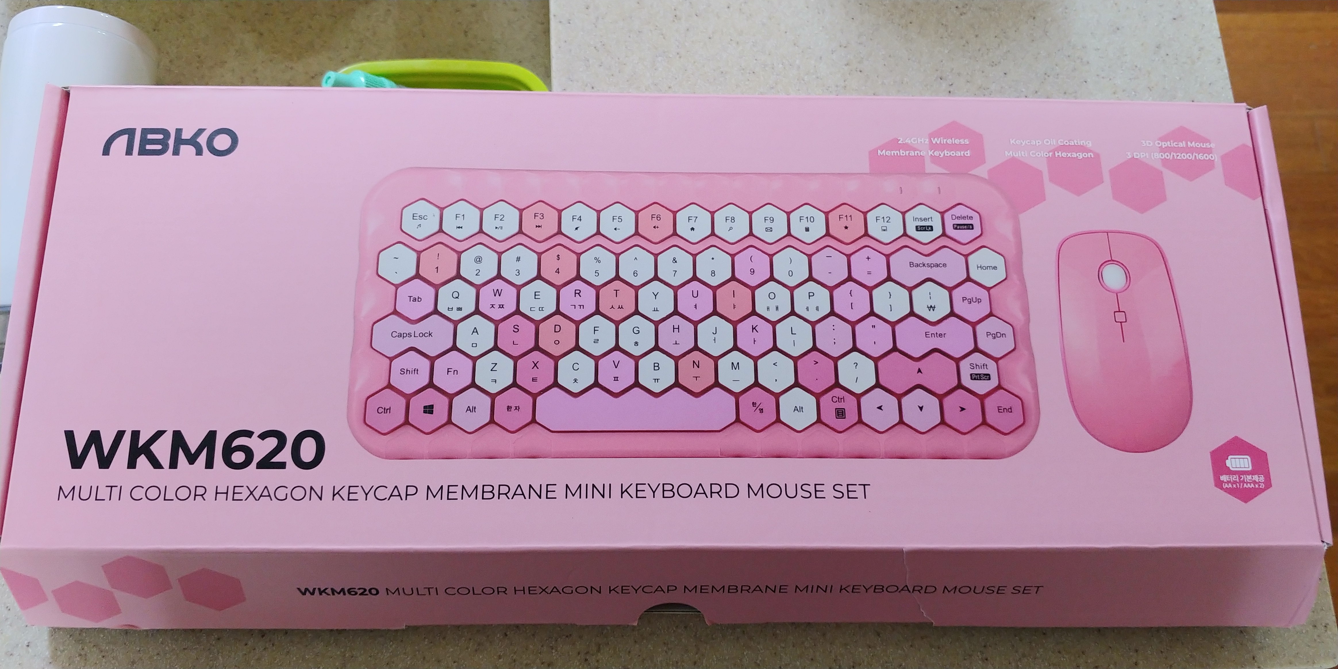 앱코 육각 벌집 무선키보드마우스세트 박스를 열어본 모습입니다.