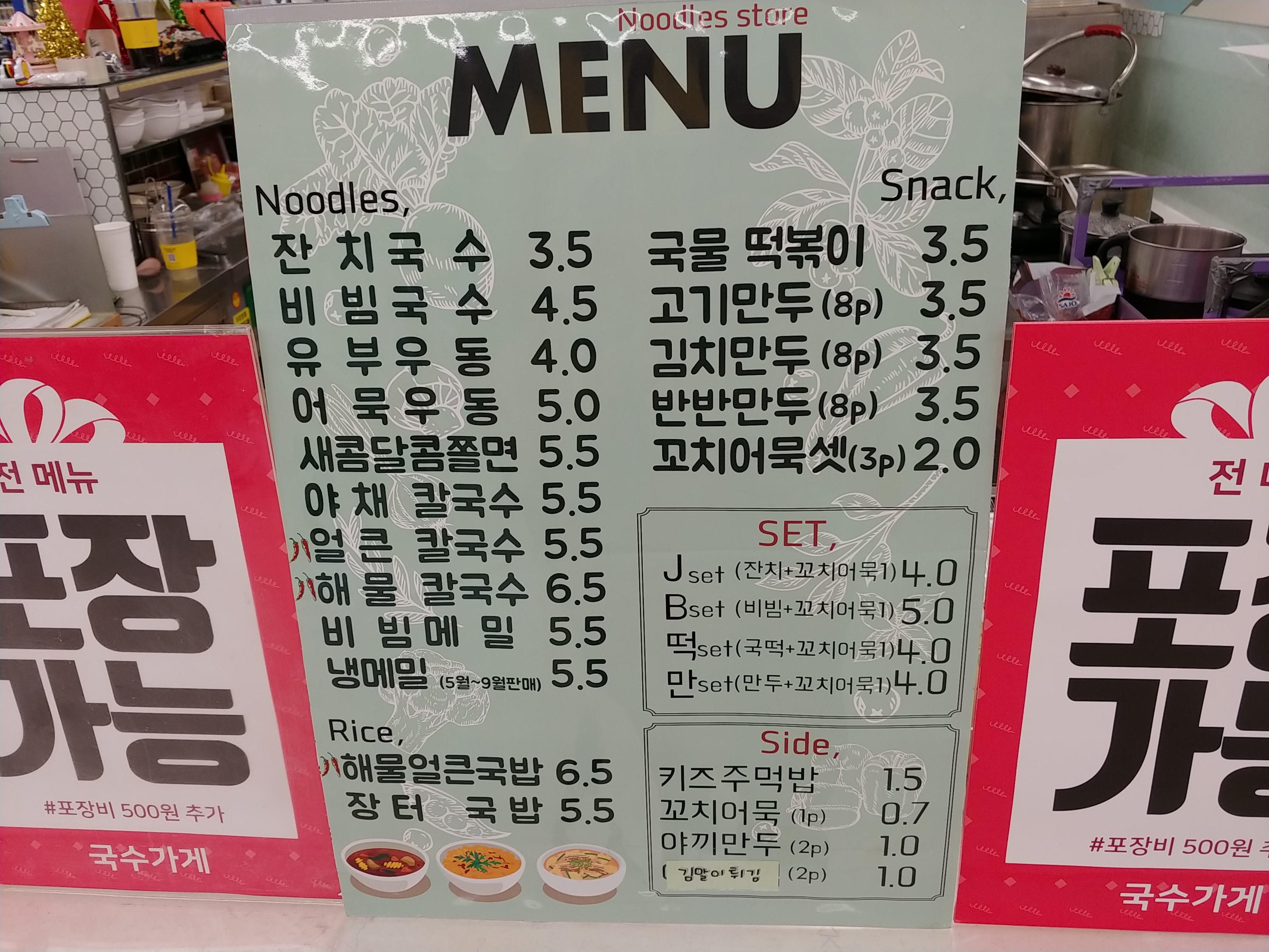 잔치국수 3.5 비빔국수 4.5 어묵우동 5.0 새콤달콤쫄면 5.5 굉장히 맛있고요.