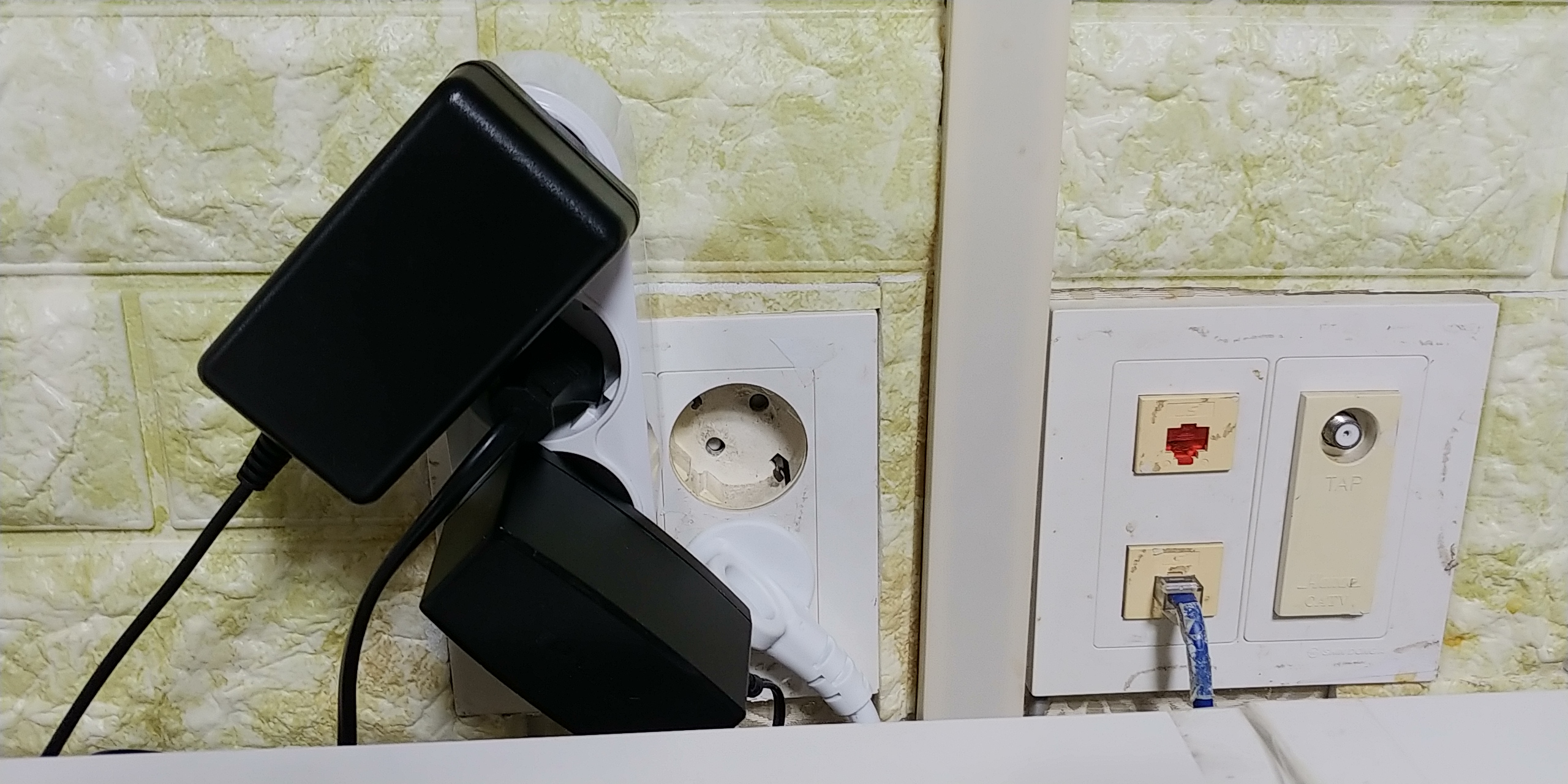 별에 한곳은 2구짜리 연장선을 꼽아서 청소기나 다른 제품들을 사용할수있게 빼놓는 용도로 고정식으로 꼽아놓앗고 회전형일자멀티탭은 유선셋업박스전원과 와이파이전원 그리고 컴 모니터전원을 꼽아서 큰 전압용량을 사용하지 않도록 조절하였고 그아래에는 그나마 전원을 좀 먹는 컴본체전원을 단독으로 꼽았고 여유로 한곳의 콘센트는 남겨두었습니다.