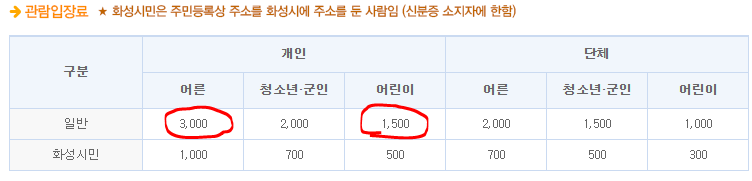 입장요금 : 어른 3000원 어린이 1500원 그리고 화성시민은 보통 지역민들