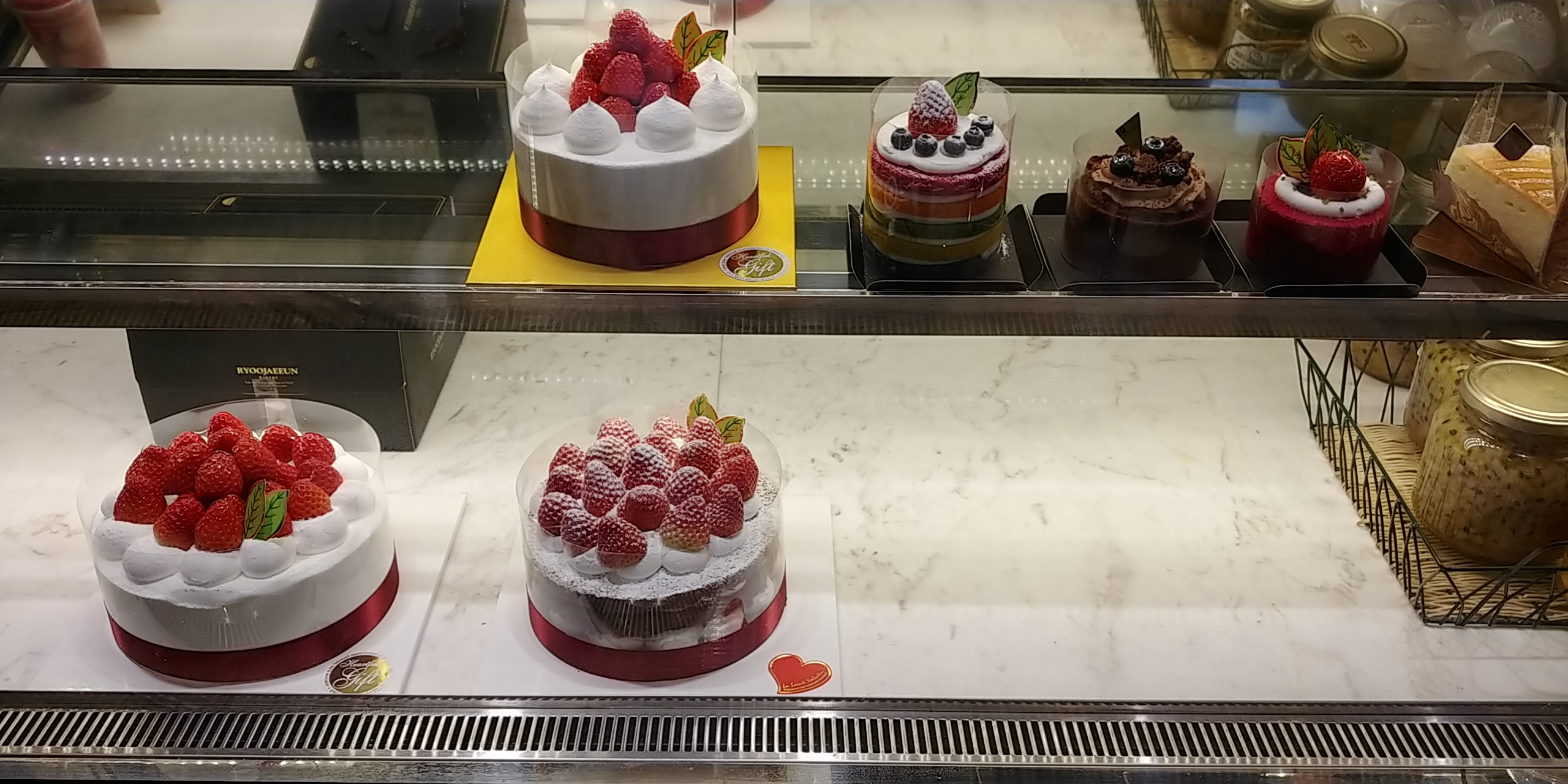 케익이 전체적으로 아담하고 빨간딸기등을 올려서 색감을 풍부하게 하는것이 눈에 띄었습니다.