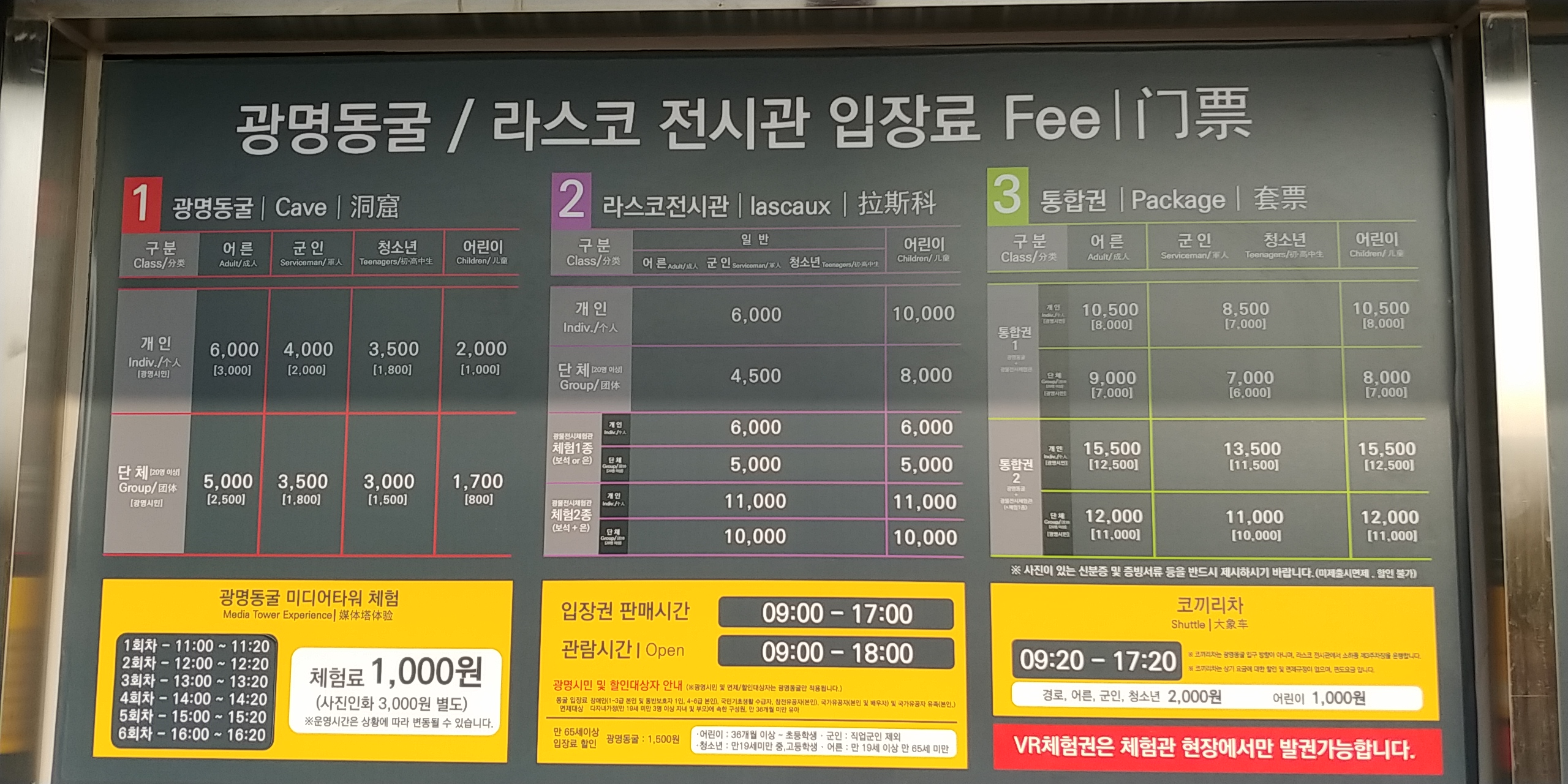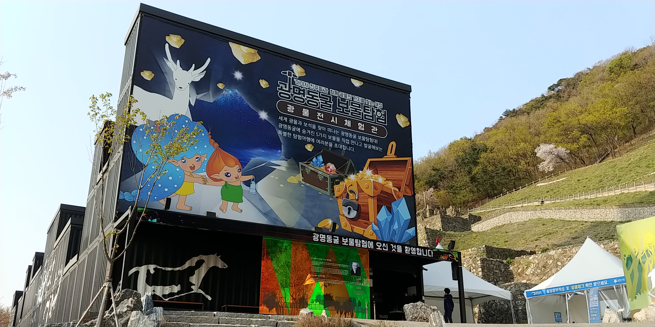 이전에는 광명동굴 바로 입구앞에 매표소가 있어서 바로 입장권을 사서 들어갔는데 지금은 바뀌어서 광명동굴 입구쪽에서 좌측으로 걸어가면 맨끝에 매표소가 있는데 3D놀이관도 운영하는데 3D안경쓰고 작은 놀이기구 타고 몇천원 주고 에니매이션을 따라서 노는 그런거 있잖아요 그거도 있어요.