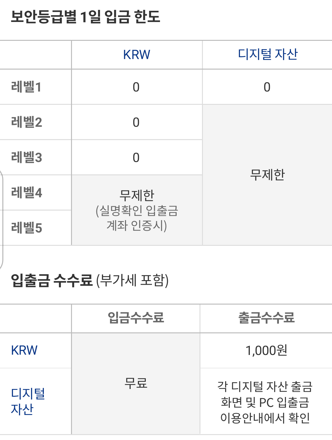 입금은 수수료가 없고 출금은 원화 출금을 할경우 건당 천원이라는 돈이 소모됩니다.