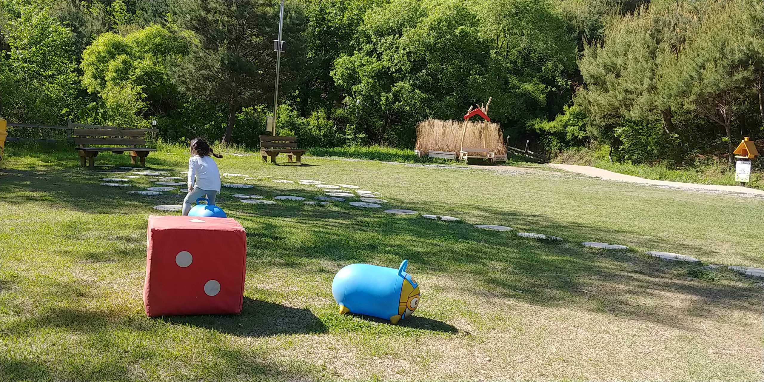정상쪽으로 올라가면 잔디공원이 있는데 뛰어놀수도 있고 고무방방이도 탈수있습니다.
