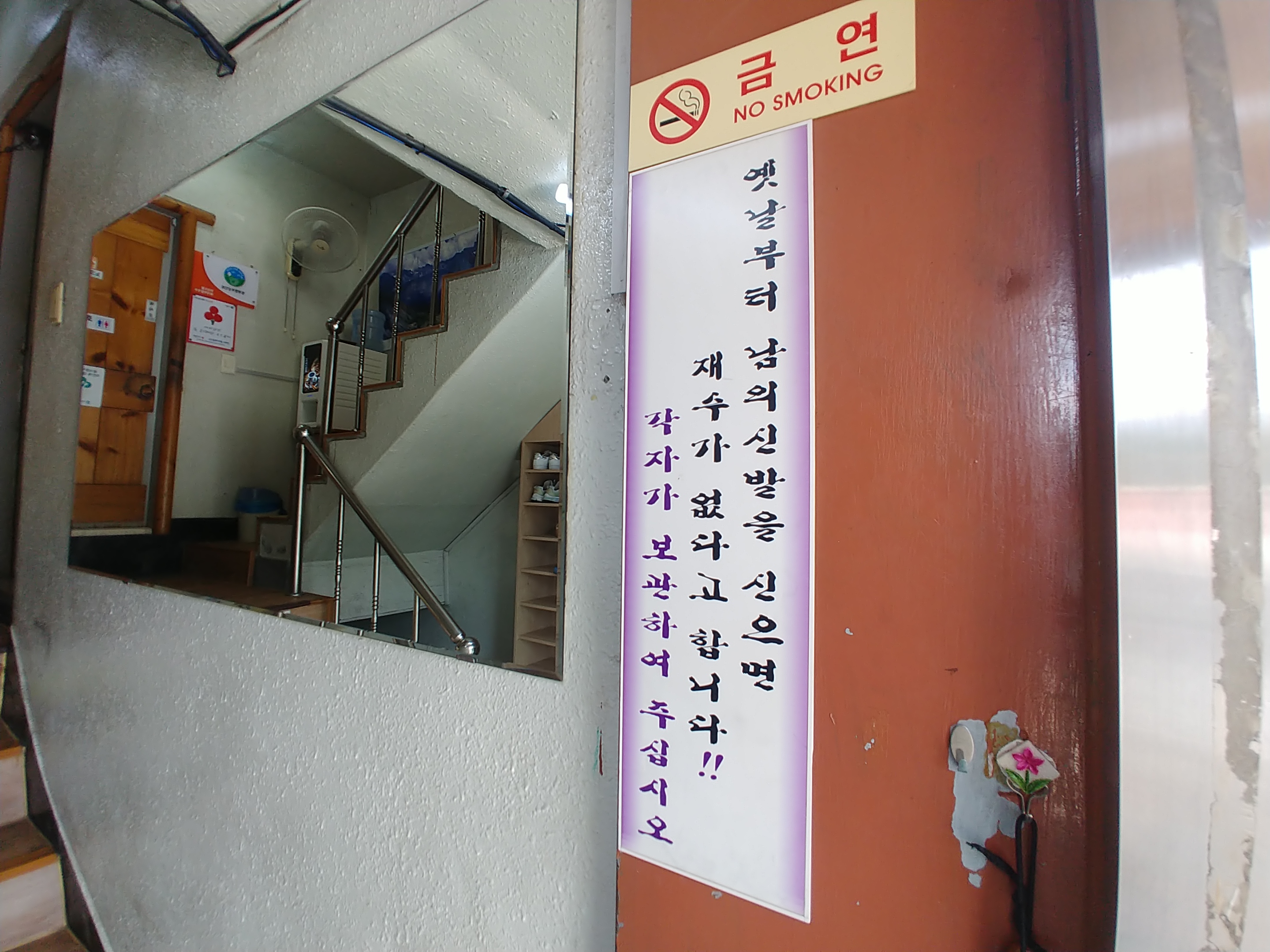 신발을 바꿔신고 가지말라는 안내문이 특이하게 크게 붙어서 안내를 하고 있습니다.