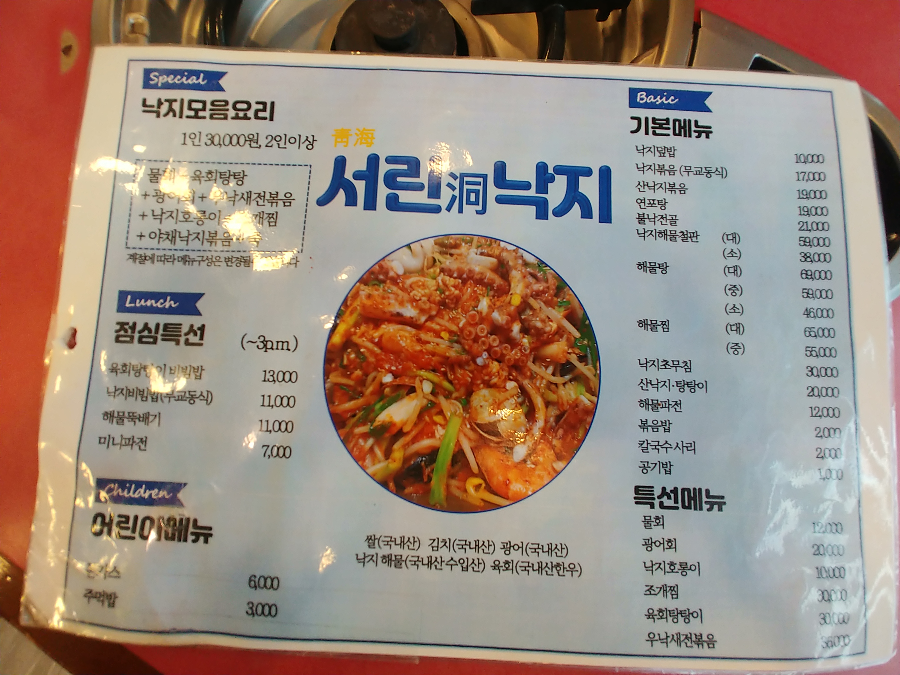 메뉴로 낙지볶음 ,연포탕,11가지이상 해물로 맛을 낸 해물찜, 불낙전골(2인이상), 낙지철판볶음(2인이상)있습니다.