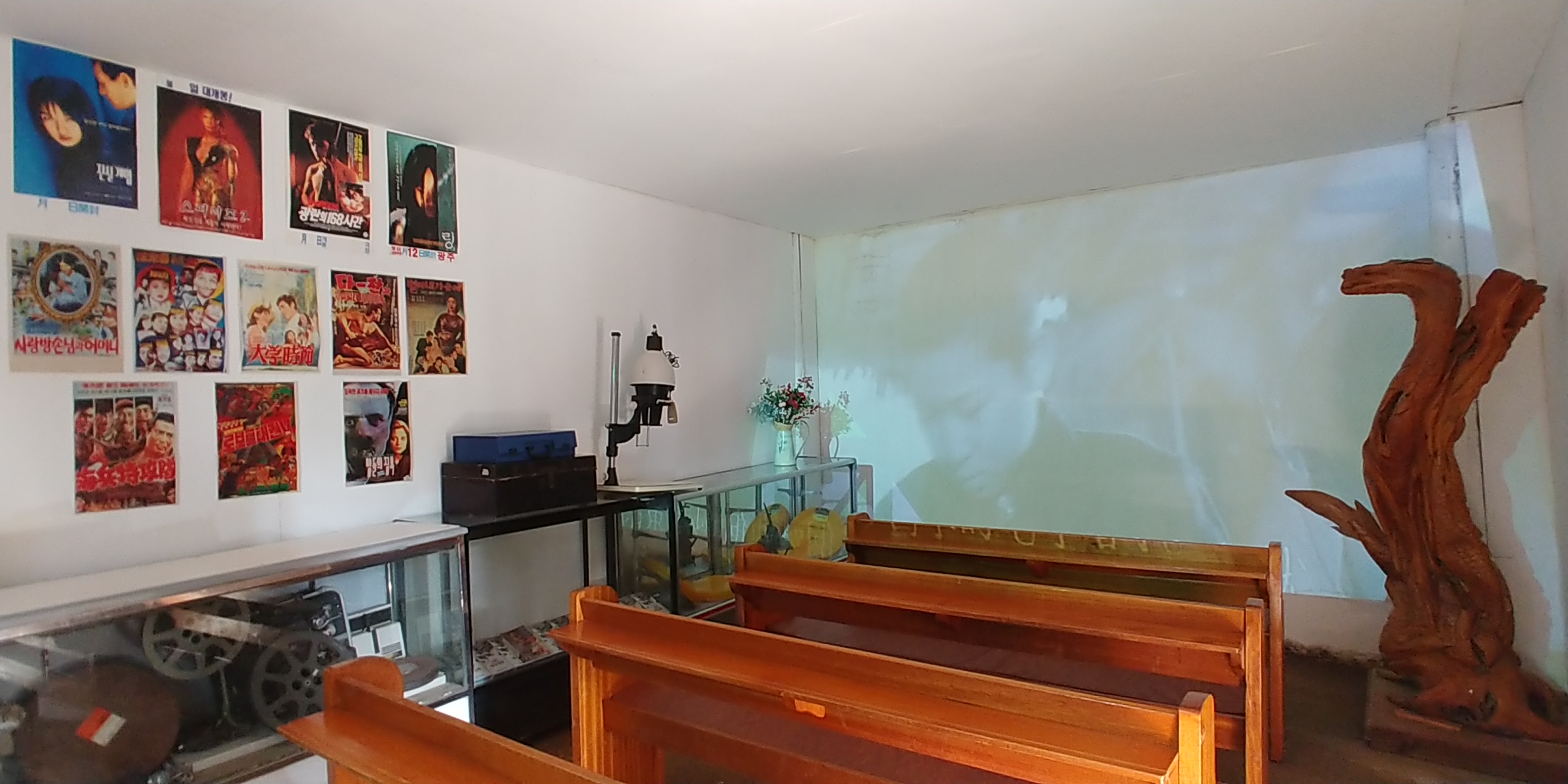 작은 영화관에는 예전 흑백영화가 방송되고있는데 의자는 교회에서 사용하던 의자같군요.
