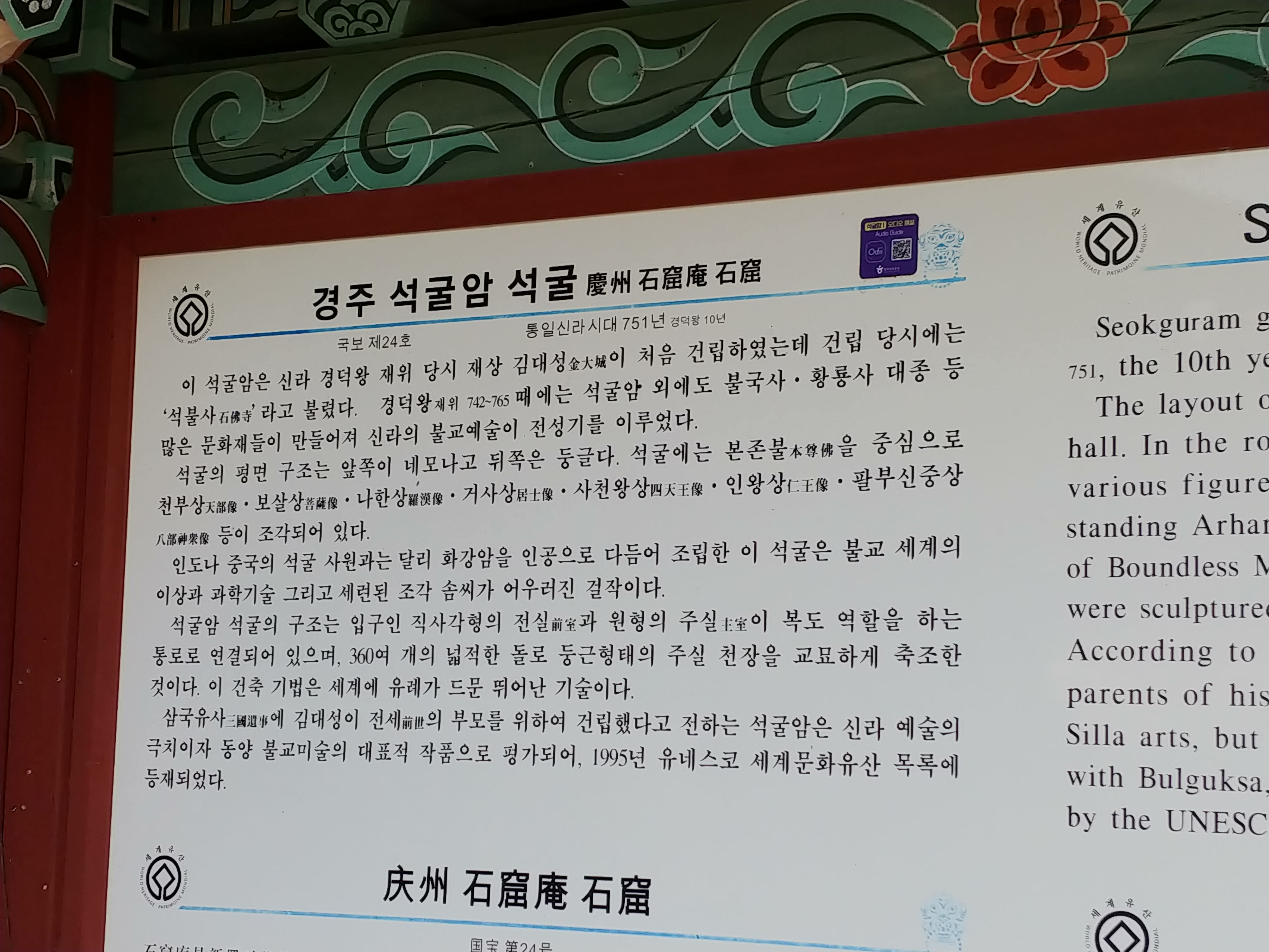 매표소앞에는 석굴암 설명문이있는데 석굴암 역시 불국사와 마찬가지로