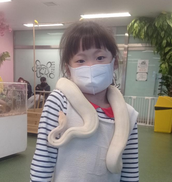 흰색비단뱀인데 아이가 안무서워하고 즐겁게 사진을 찍었습니다.