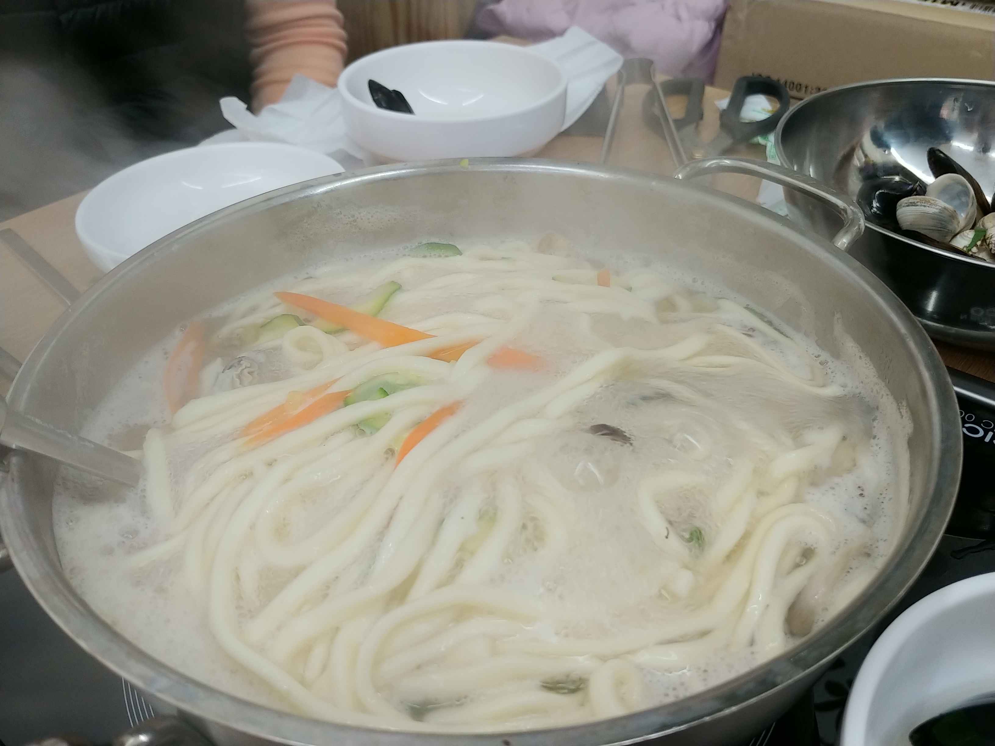 조개를 종류별로 넣었고 이곳을 물총칼국수라고 하는게 물총조개를 넣는데 물총처럼 찍찍 물을 뿝는 조개라서 그런건대 동죽이랑 홍합 바지락을 잔뜩 채웠습니다.