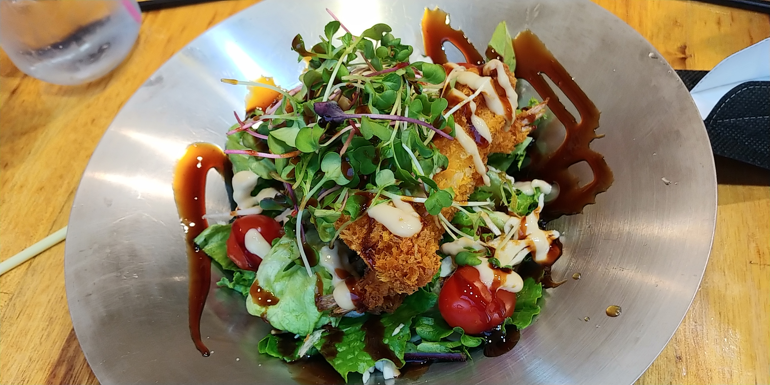 야채 새싹 신선하고 튀김도 적당히 잘 익혔군요.